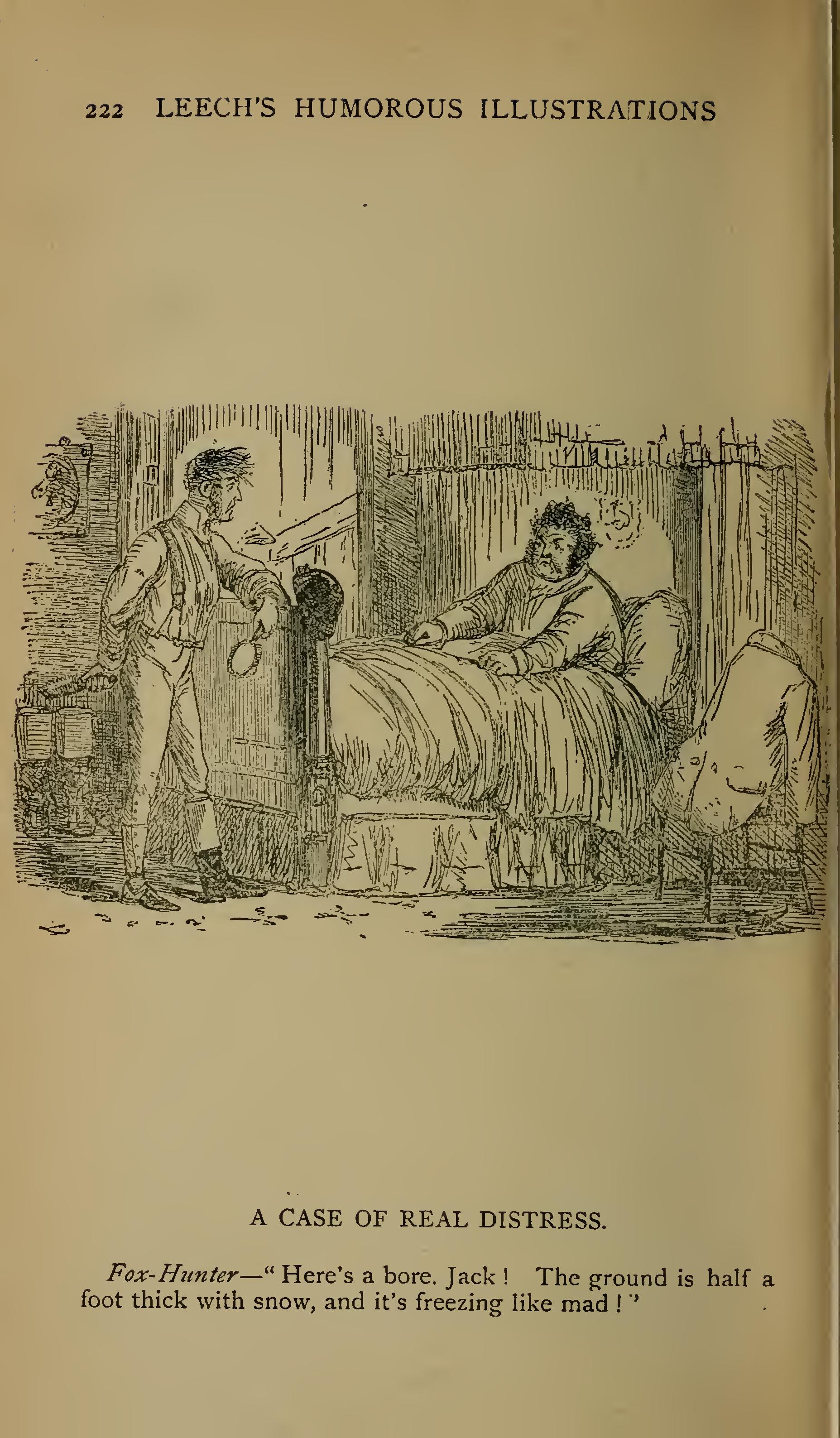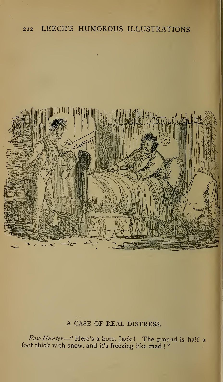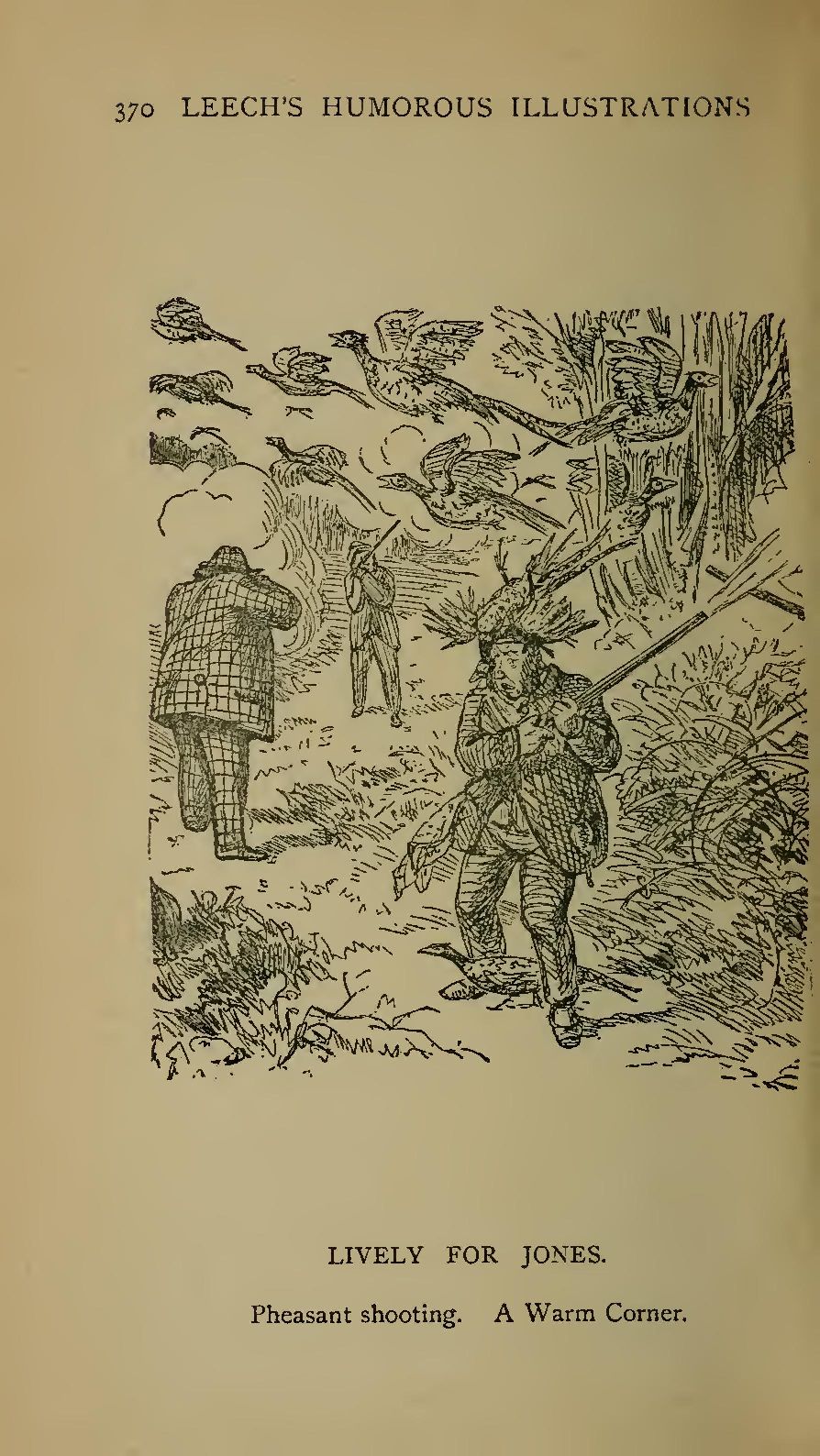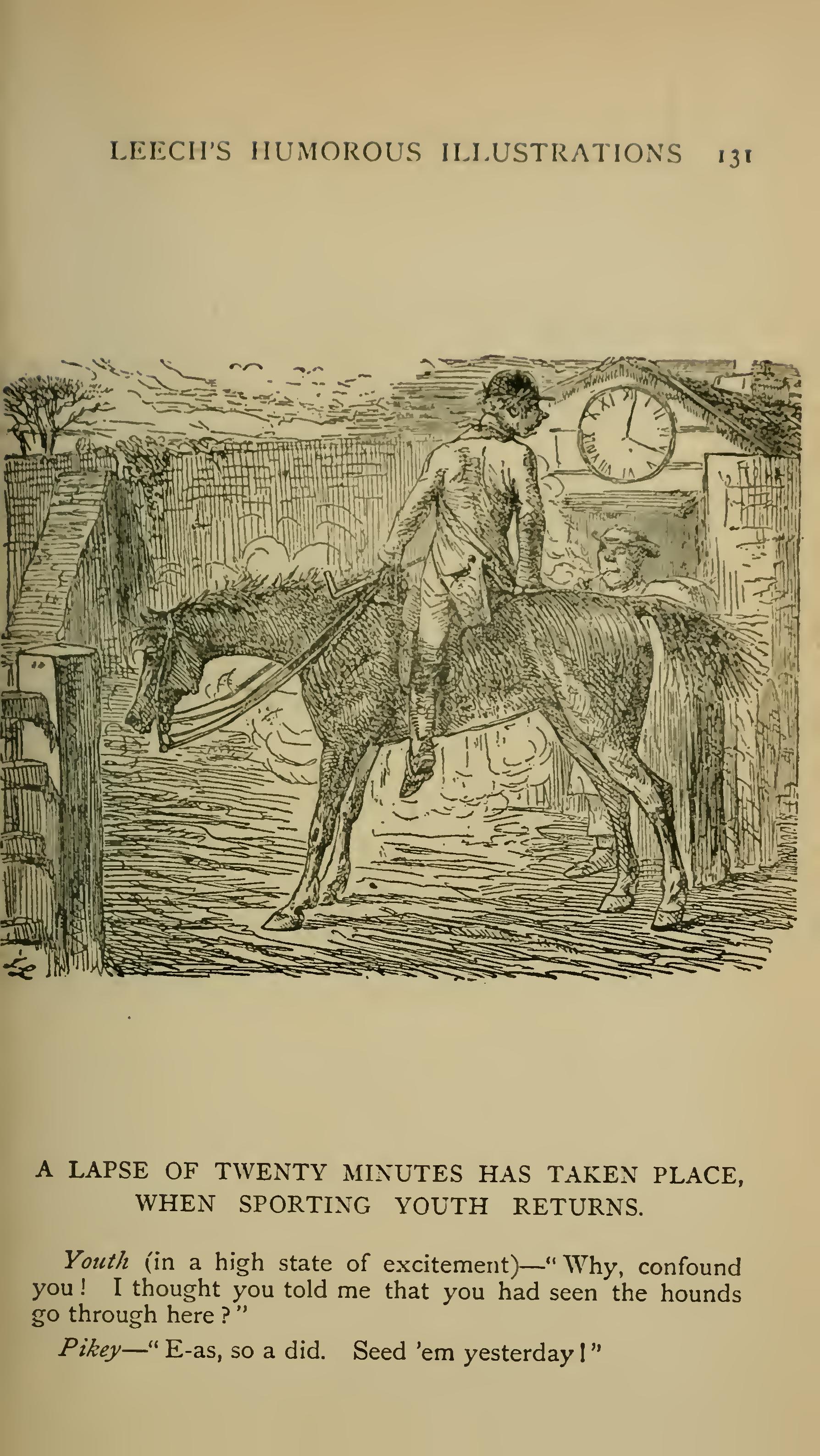 At eighteen years of age, Leech published his first work, entitled "Etchings and Sketchings by A. Pen, Esq." It was a small work of four quarto sheets. As he got more and more engrossed in artistic work, the young student seems to have gradually given up his medical studies, and to have resolved to live by his pencil. In course of time he turned his attention to lithography, and, having drawn pictures upon lithographic stones, he has been known to spend many a weary day in carrying such heavy stones from publisher to publisher in search of a buyer. But as his fame increased, the difficulty of getting remunerative employment rapidly diminished. A good deal of Leech's early work, among other things, was in connection with Bell's Life in London, the best-known sporting paper of the time. Here he was associated with Cruikshank, Madons, "Phiz," and Seymour. It was when at work for Bell's Life that he first imbibed a taste for field sports, which developed into a strong feature in his pictorial career. He joined the hounds in Herefordshire, where Millais became his fellow pupil in acquiring the arts of the chase. Among the schemes of drollery that our artist participated in about this time was the Comic Latin Grammar, Leigh contributing the text, and Leech the illustrations. This was followed by the Comic English Grammar, and likewise by the Children of the Mobility, a parody on a well-known work devoted to the serious glorification of our juvenile aristocracy.