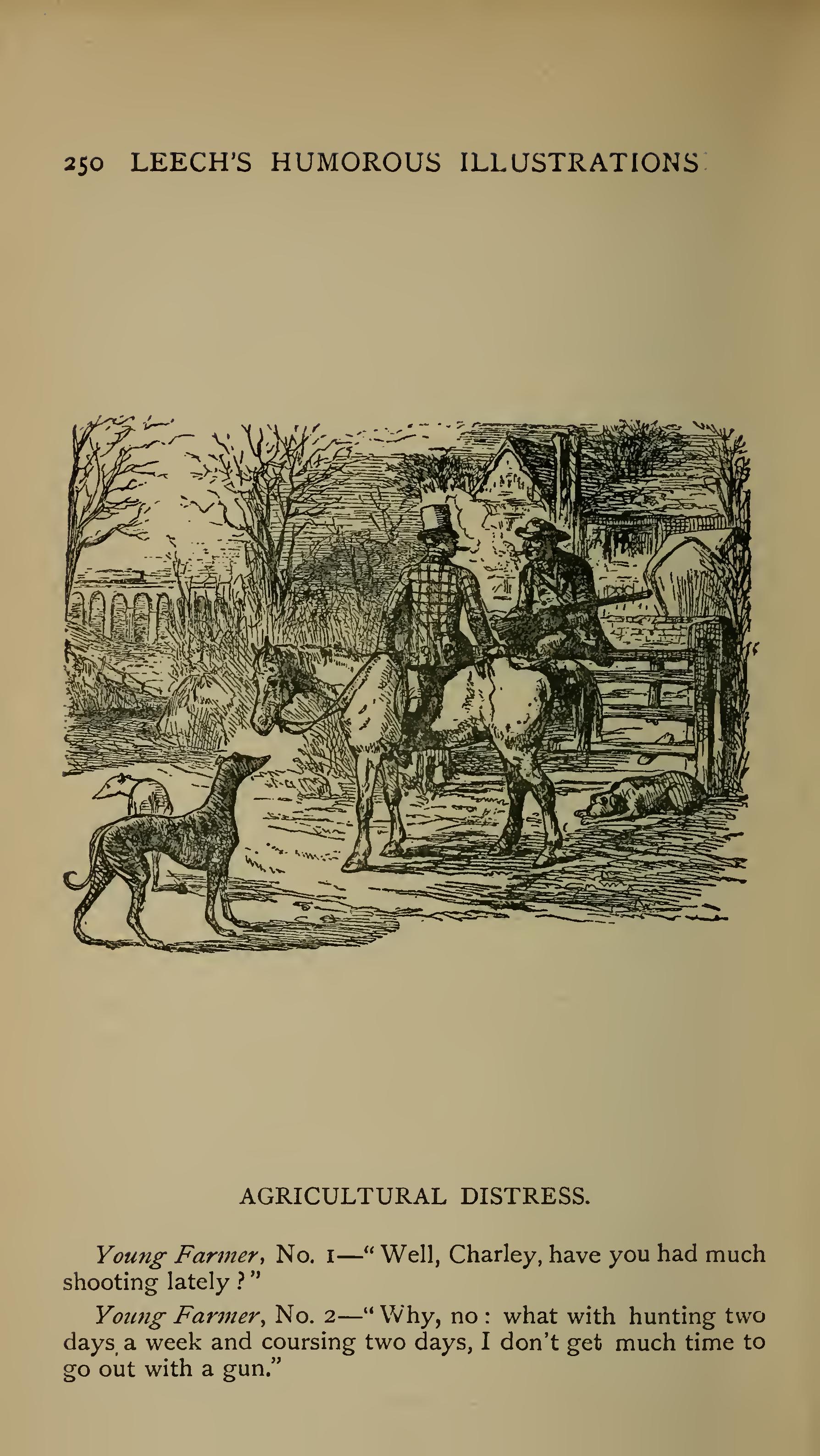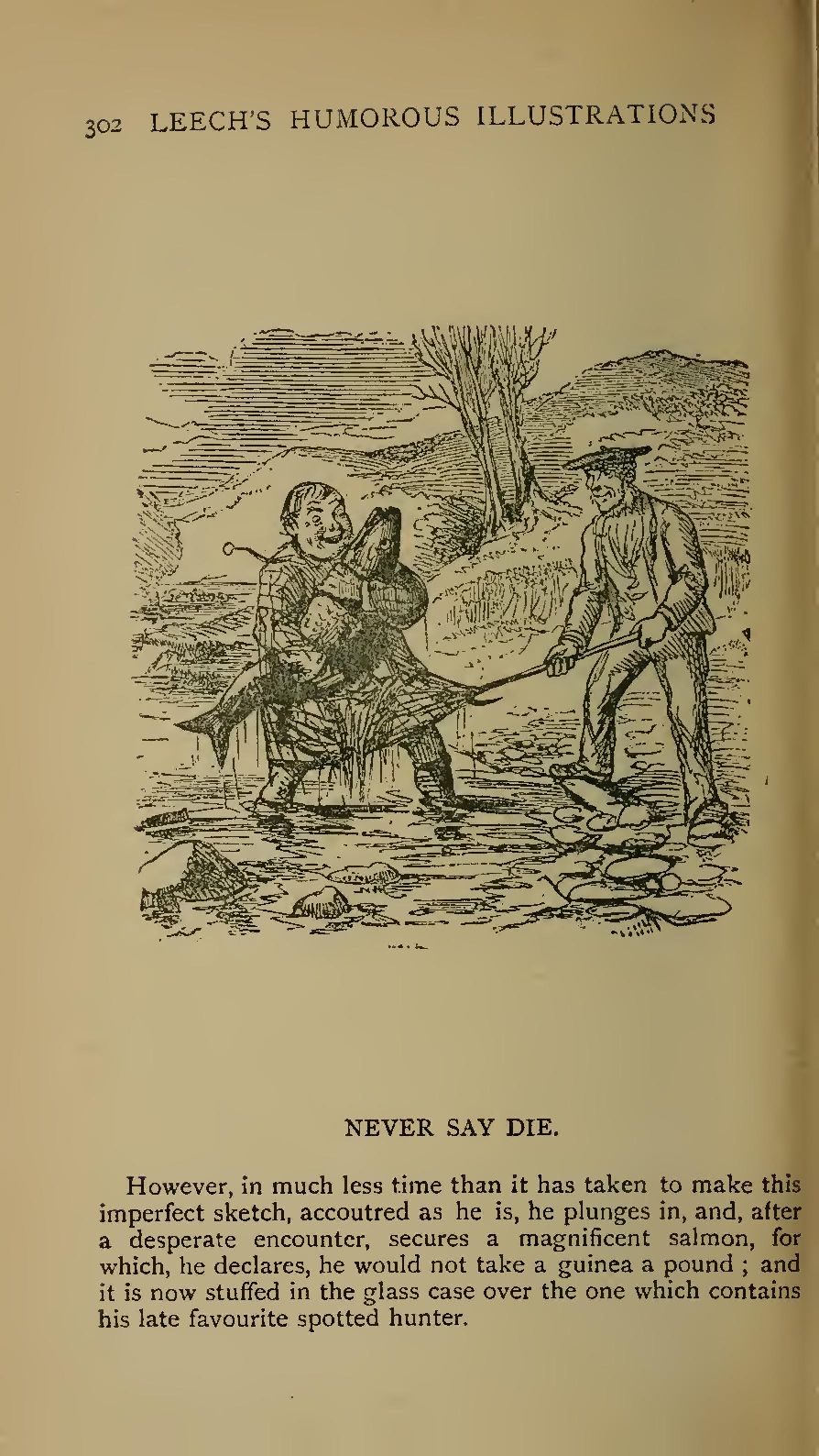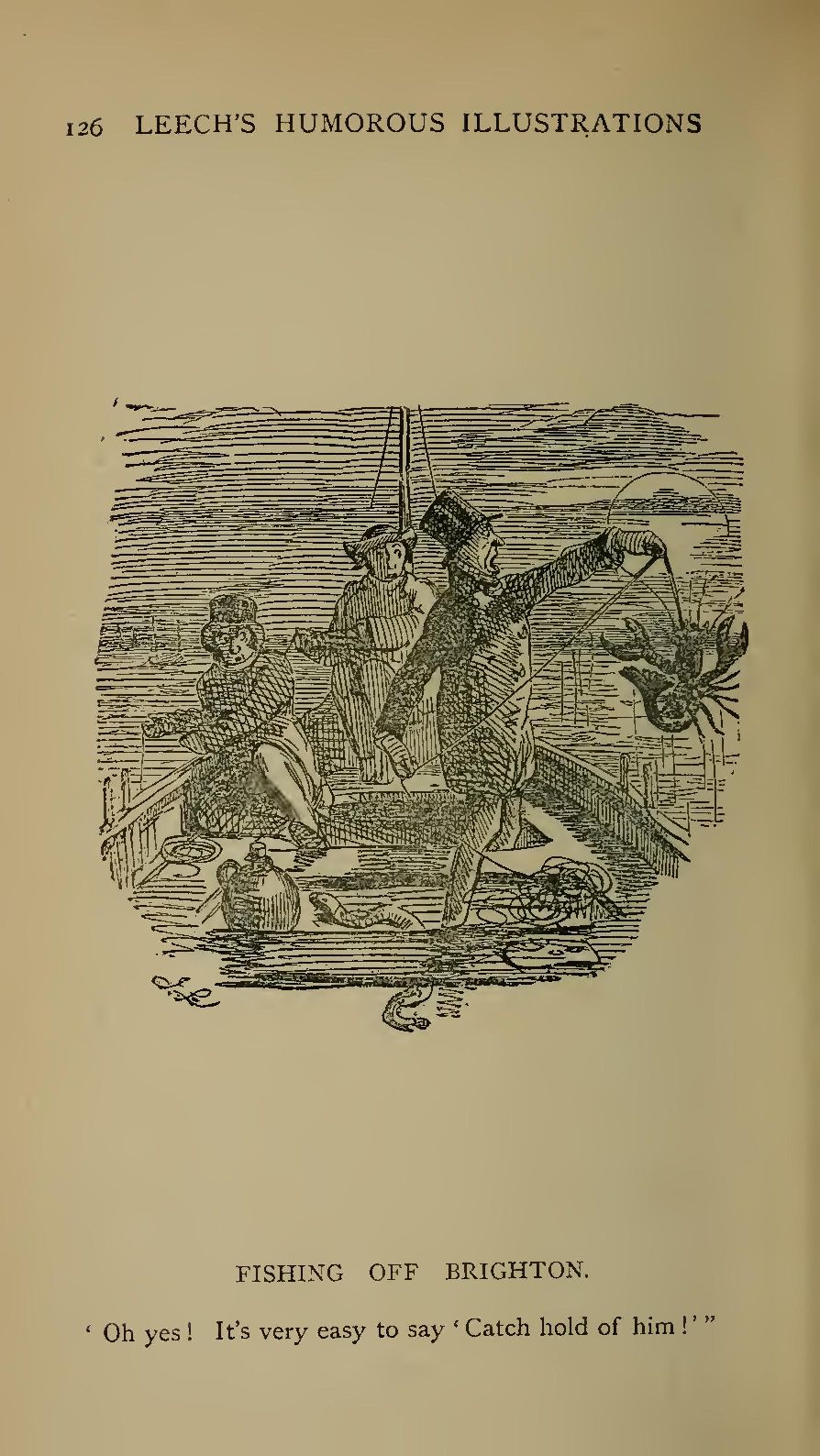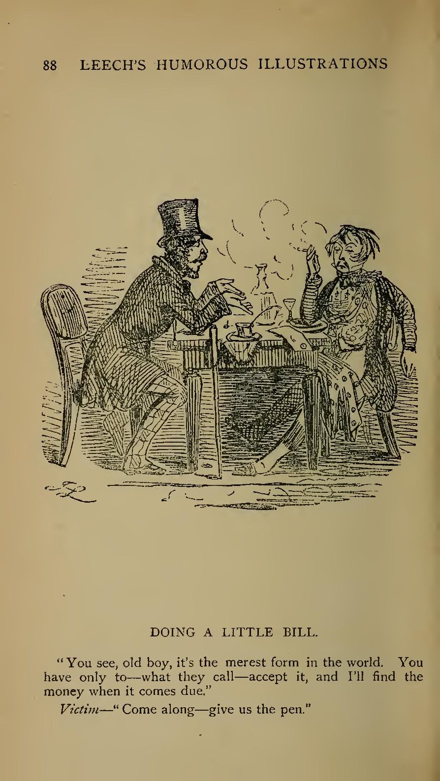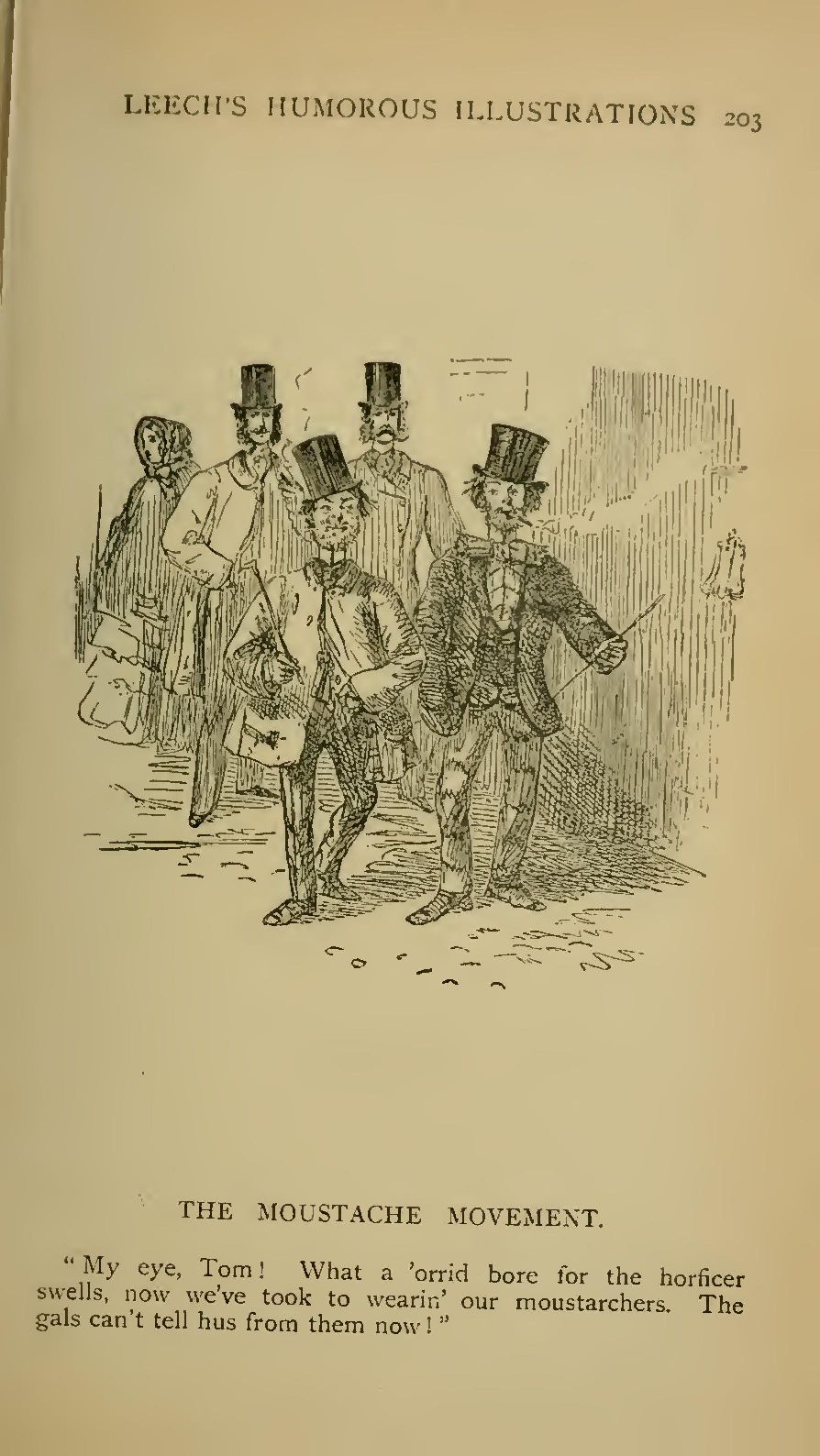 At eighteen years of age, Leech published his first work, entitled "Etchings and Sketchings by A. Pen, Esq." It was a small work of four quarto sheets. As he got more and more engrossed in artistic work, the young student seems to have gradually given up his medical studies, and to have resolved to live by his pencil. In course of time he turned his attention to lithography, and, having drawn pictures upon lithographic stones, he has been known to spend many a weary day in carrying such heavy stones from publisher to publisher in search of a buyer. But as his fame increased, the difficulty of getting remunerative employment rapidly diminished. A good deal of Leech's early work, among other things, was in connection with Bell's Life in London, the best-known sporting paper of the time. Here he was associated with Cruikshank, Madons, "Phiz," and Seymour. It was when at work for Bell's Life that he first imbibed a taste for field sports, which developed into a strong feature in his pictorial career. He joined the hounds in Herefordshire, where Millais became his fellow pupil in acquiring the arts of the chase. Among the schemes of drollery that our artist participated in about this time was the Comic Latin Grammar, Leigh contributing the text, and Leech the illustrations. This was followed by the Comic English Grammar, and likewise by the Children of the Mobility, a parody on a well-known work devoted to the serious glorification of our juvenile aristocracy.