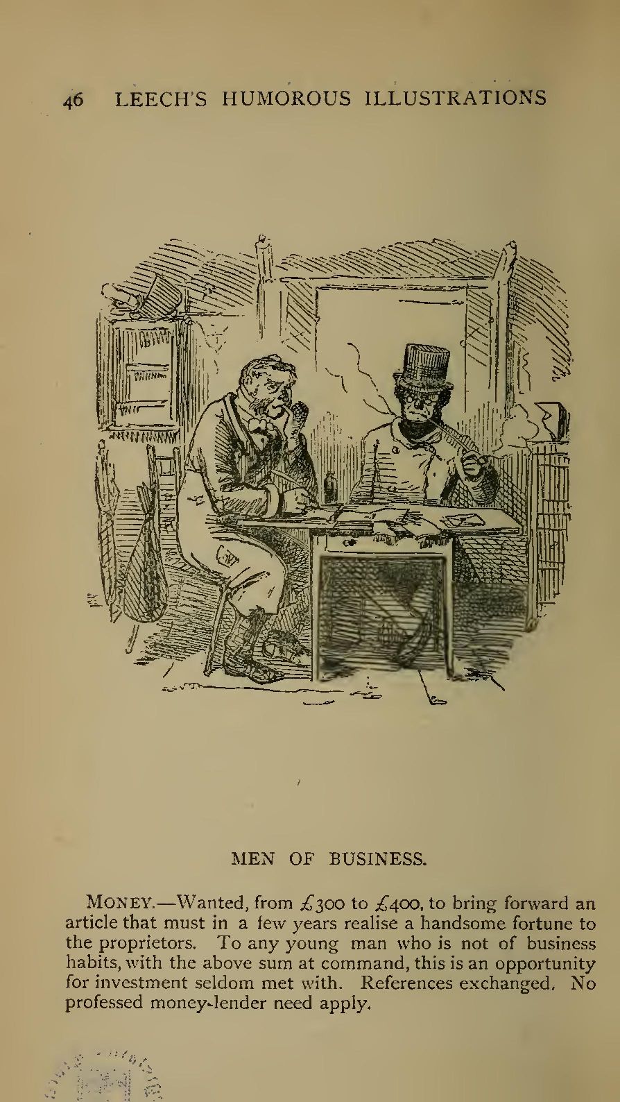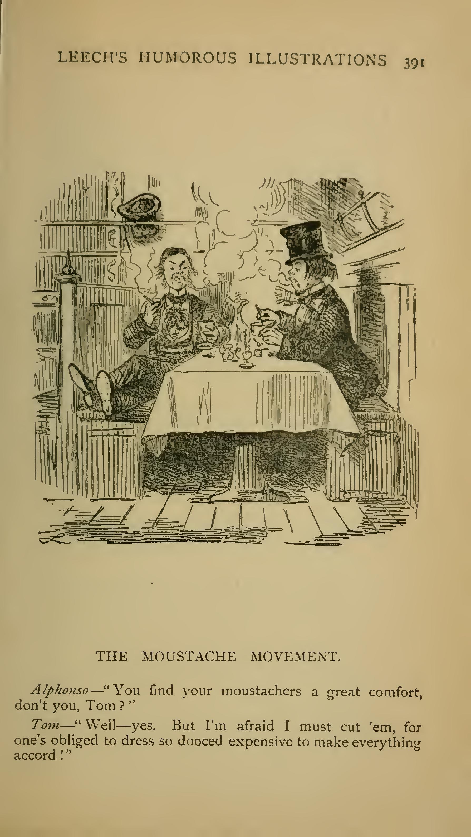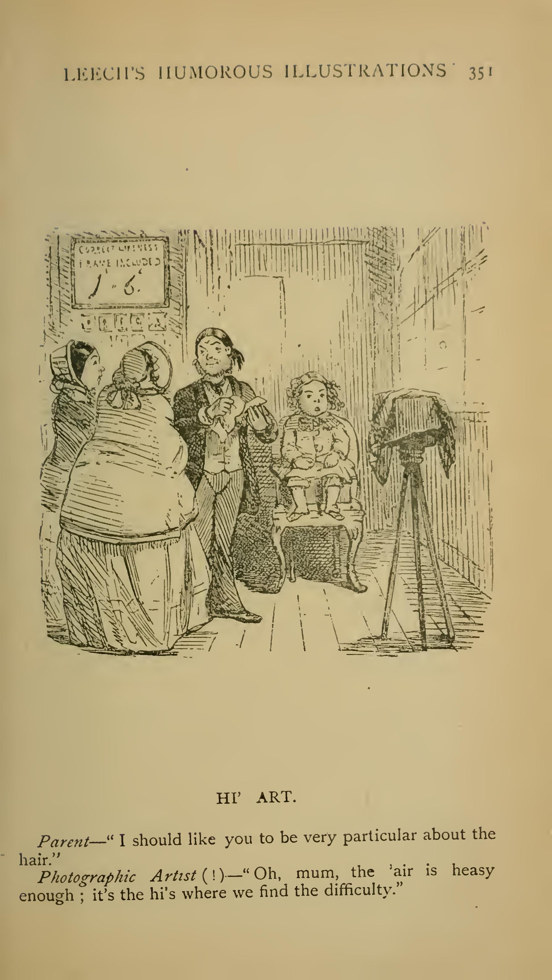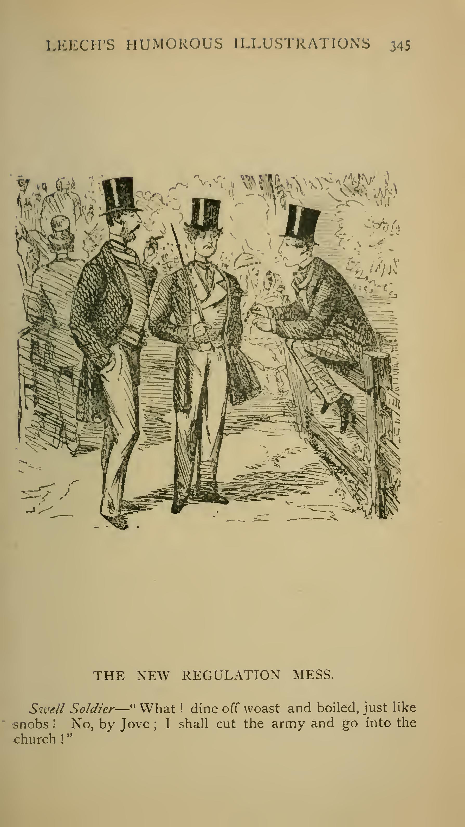 At eighteen years of age, Leech published his first work, entitled "Etchings and Sketchings by A. Pen, Esq." It was a small work of four quarto sheets. As he got more and more engrossed in artistic work, the young student seems to have gradually given up his medical studies, and to have resolved to live by his pencil. In course of time he turned his attention to lithography, and, having drawn pictures upon lithographic stones, he has been known to spend many a weary day in carrying such heavy stones from publisher to publisher in search of a buyer. But as his fame increased, the difficulty of getting remunerative employment rapidly diminished. A good deal of Leech's early work, among other things, was in connection with Bell's Life in London, the best-known sporting paper of the time. Here he was associated with Cruikshank, Madons, "Phiz," and Seymour. It was when at work for Bell's Life that he first imbibed a taste for field sports, which developed into a strong feature in his pictorial career. He joined the hounds in Herefordshire, where Millais became his fellow pupil in acquiring the arts of the chase. Among the schemes of drollery that our artist participated in about this time was the Comic Latin Grammar, Leigh contributing the text, and Leech the illustrations. This was followed by the Comic English Grammar, and likewise by the Children of the Mobility, a parody on a well-known work devoted to the serious glorification of our juvenile aristocracy.