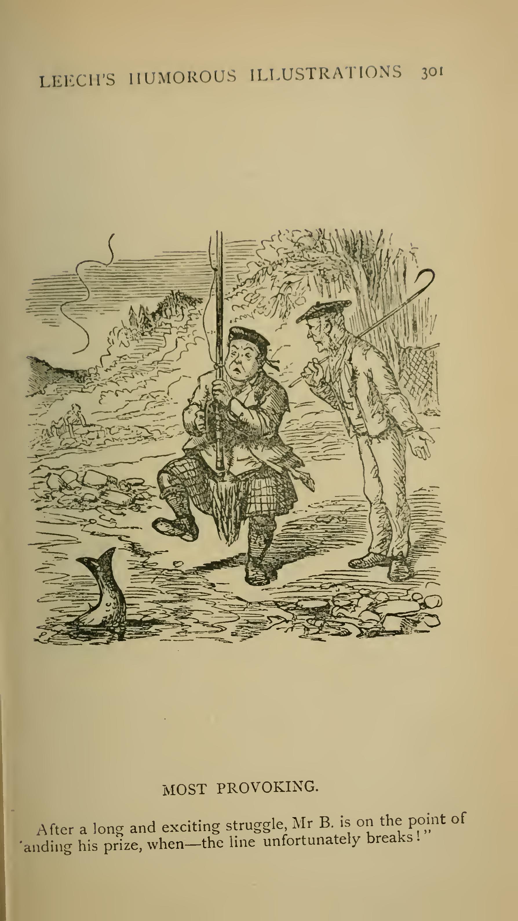 But in August of 1841 Leech began the great work of his life—a work, indeed, which he never quitted but with life—namely, his connection with Punch. The first number of Punch was issued on the 17th July, 1841, and Leech's first contribution to it appeared on the 7th August, in the fourth number. For about twenty years, it may be said, he was its leading spirit, and, by his contributions to its pages, got in all about £40,000. Political caricatures he produced by the score, and held up to ridicule many of the absurd customs of the pretensious and exclusive sections of Society. Like Thackeray and Dickens, Leech detested snobbery in all walks of life, and depicted it unsparingly in a way that it never had been dealt with before. Week after week there flowed from his pencil an endless stream of scenes of high life and low life, of indoor life and street life, now of England, and then of foreign lands, and of all times, seasons, and occasions, as also numerous scenes of deer-stalking and fishing, and of horses and hounds, in all cases depicting whatever he undertook with extraordinary accuracy combined with infinite humour. Also, when social or national wrong called for grave censure, Leech knew how to administer it, not only without giving unnecessary offence, but in the way best calculated to bring about reform and redress. In all circumstances he was essentially a humorist, and he found his most genial vocation in depicting life and character in the social circles he frequented. As a keen observer of the everyday life around him, he delighted to depict the corporation magnate, the artist, the medical student, the spendthrift, the policeman, the cab driver, the coster, the carman, and hundreds of other such phases of everyday life and character, seeing humour and drollery where others failed to observe anything but the commonest aspects of everyday monotony. Of course it should not be forgotten that, if Leech did great things for Punch, his connection with that journal gave him great opportunities, and brought him into the very forefront of British artists. He was considered the most successful humorist of the day, and his pencil was in constant request. In the course of years he became the illustrator of about eighty volumes. When it is realised that the sketches in Punch and the illustrations in these eighty volumes combined amount to some thousands in number, the mind is much impressed with the great amount of industry and application that Leech displayed throughout life. Even a tour to the Highlands, or to Ireland, or an outing to any portion of the country, was at all times turned to practical account for work later on.
