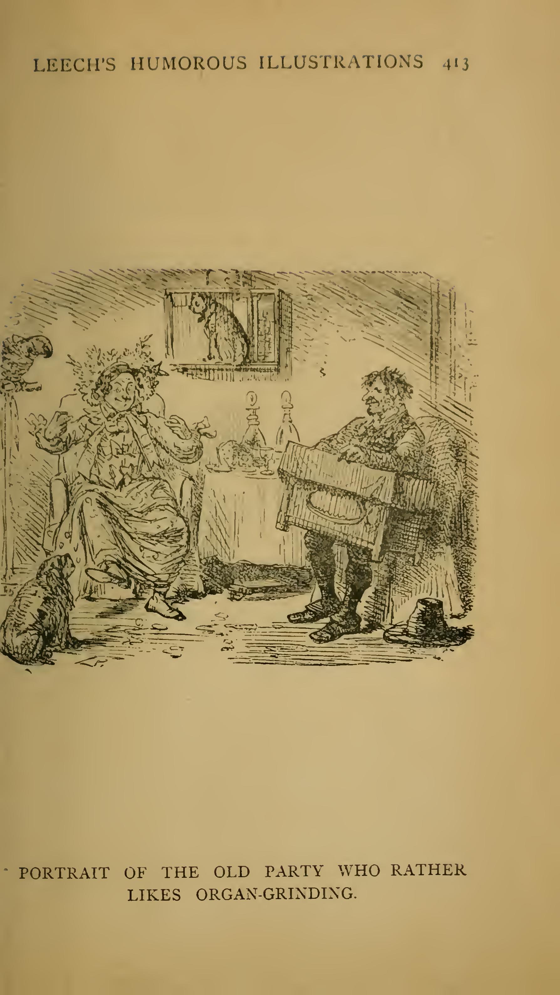 This incessant brain-work produced an extreme nervous sensitiveness. In this state he was much affected by noise and was literally driven from his house in Brunswick Square by street music. He removed to Kensington, where he hoped to obtain a release from this annoyance by adopting a device of double windows. But he had no peace. He often introduced in the pages of Punch the barrel-organ nuisance. The public, however, at that time had no idea what these sketches from real life cost the artist. In 1864, Leech was ordered to take a holiday on the Continent. Upon his return to his London home in the autumn of the same year, although better in health, he was still strangely susceptible to noise. He spoke with more than his usual earnestness about the sufferings which the street organs gave him, and about the smallness of the sympathy which he received from people who had no weakness in the same direction. This extraordinary sensitiveness to noise was only a secondary phase or symptom of the real ailment. The real malady from which he suffered was breast-pang, or spasms of the heart, a form of angina pectoris. Although it was necessary to warn Leech against all excitement, riding, quick walking, or overwork, it was not supposed that he was in immediate danger, and, if he could only find rest and quiet, great hopes were entertained of his recovery. However, the sad end came when quite unexpected. In the morning of the 29th of October, 1864, he spoke hopefully of the future to his wife. In a few hours afterwards he whispered into the same living ear—"I am going," and fell into his father's arms in a faint. Three hours afterwards he expired. The news of his death went over the country with a dismal shock; for in what house was John Leech not an inmate in one form or another?