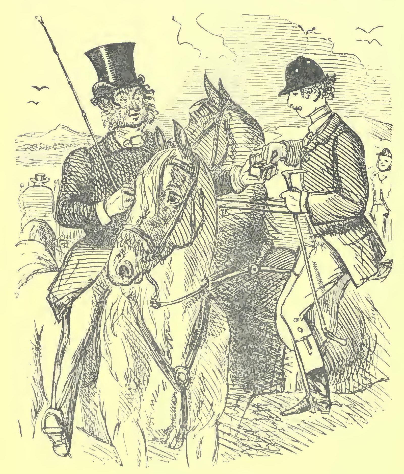 “Here, lassie!” cried he to the little girl who had now returned from the stable, “lay cloth i’ next room foike, and then finish the fryin’; and oi’ll tell ve what,” continued he, laying his huge hand on Mrs. Margerum’s shoulder, “oi’ve got to go to it champion cooursin’ meetin’, so I’ll just put it hus into harness and droive ye round by it Bird-i’-the-Bush, where we’ll find Carroty Kebbel, who’ll tell us what te do, for oi don’t like the noight-cap business some hoo,” so saying Mr. Gallon took his silver plated harness down from its peg in the kitchen, and proceeded to caparison Tippy Tom, while the little girl, now assisted by Mrs. Margerum, prepared the breakfast, and set it on the table. Rather a sumptuous repast they had, considering it was only a way-side beer-shop; bubble-and-squeak, reindeer-tongue, potted game, potted shrimps, and tea strikingly like some of Sir Moses’s. The whole being surmounted with a glass a-piece of pure British gin, Mr. Gallon finished his toilette, and then left to put the high-stepping screw into the light spring-cart, while Mrs. Margerum reviewed her visage in the glass, and as the openworks clock in the kitchen struck nine, they were dashing down the Heatherbell-road at the rate of twelve miles an hour.