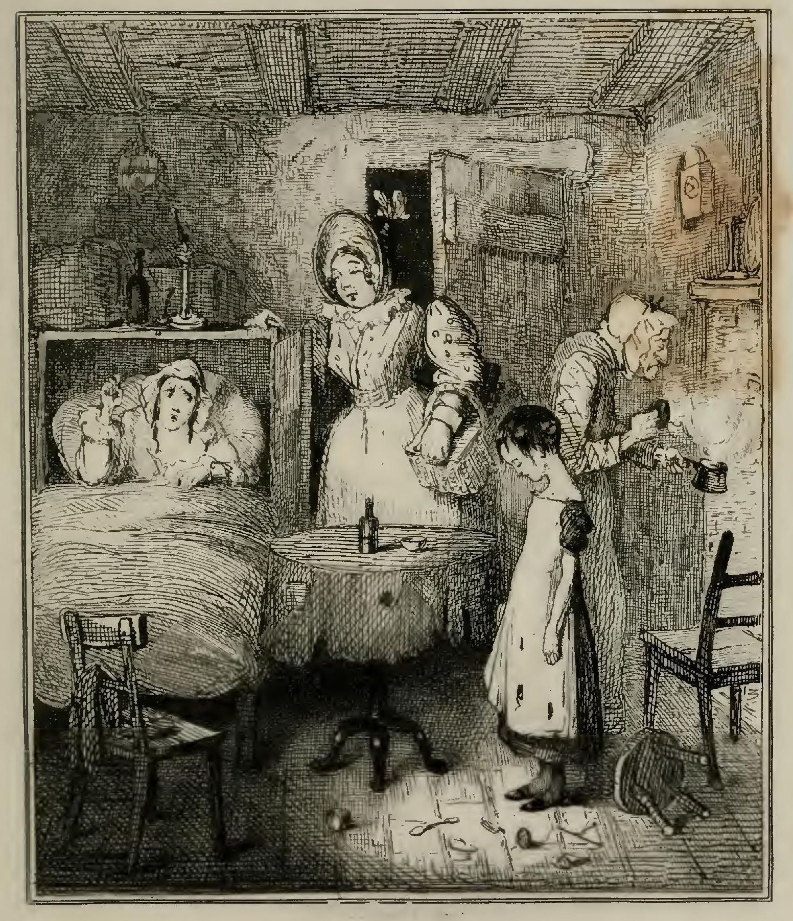 On the eventful day that gave young Master Colin Clink to the world, and about twelve hours previous to the time at which he should have made his actual appearance, Mistress Clink, his mother, was lying upon a bed in an inner ground-floor room of her cottage, think-ing—if the troubled and confused ideas that filled her brain might be termed thinking—upon her coming trials; while little Fanny, taking temporary advantage of the illness of her mistress, and relaxing, in a moment of happy forgetfulness, again into a child, was sitting upon the ground near the door, and noiselessly amusing herself by weighing in a halfpenny pair of tin scales the sand which had been strown upon the floor by way of carpet, when the abrupt entrance of some one at the outer door, though unheard by the sick woman amidst her half-dreaming reveries, so startled the little offender on the ground, that, in her haste to scramble on to her feet, and recover all the solemn proprieties and demure looks which, in a returning moment of infantile nature, had been cast aside, she upset the last imaginary pound of sand-made sugar that had been heaped up on a stool beside her, and at the same time chanced to strike her head against the under side of the little round table which stood at hand, whereby a bottle of physic was tossed uninjured on to the bed, and a spoon precipitated to the floor. Her countenance instantly changed to an expression which told that the crime was of too black a dye to be forgiven. But patience without tears, and endurance without complaint, were also as visible; virtues which hard necessity had instilled into her bosom long before.