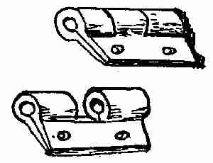 The butt for the hinge is made of 1 × 1⁄2 in. flat wrought iron. Fuller down the end of the piece, round it up to fit the diameter of the eye of the hinge. A hole is punched in the middle of the piece. A 21⁄2 × 1⁄2 in. piece of iron is drawn and is pushed into the hole, riveted down on the short end, and welded. The other end is drawn out to a square tapered point. Nick the four edges at intervals with a sharp chisel, thus throwing up little projections to prevent it from slipping out of the wood when driven in to hold the hinge. This kind of hinge is used mostly for doors. The upper part of the pin that sticks through the eye of the hinge is ornamented by a fuller mark and a round top.