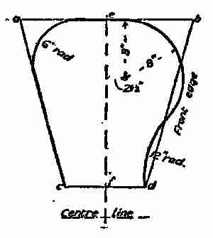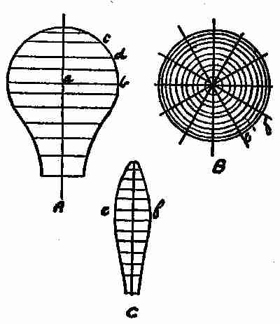 Divide this into twelve parts by radius lines, then make pattern as follows: Draw a perpendicular, C, with horizontal lines at distance of horizontal lines on A, but measured on circumference as c d. Then set off on each line from perpendicular one half the distance between the radius lines, B, on the corresponding circle as e f; draw line through points thus found, and result will be shape of each section. Allow a little on one side when cutting out for pasting. [370] This will be best made with strong tissue paper of any colour desired.