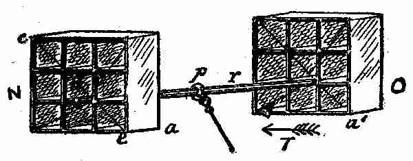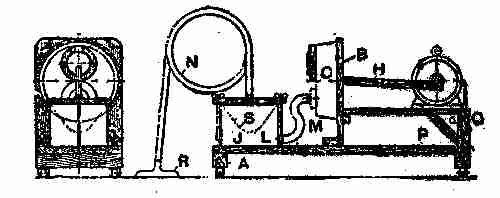 This machine may be driven by an electric motor of about 11⁄4 horse-power, which should be placed in the position shown in Fig. 218. The end of the connecting rod H is fastened to a crank on the motor shaft, and allowed to have about a one and one half inch stroke. The motor is wired up with a switch, P, and it would be best to connect to a rheostat, to allow the regulation of speed best suited to the machine. This can readily be determined after the machine is [386] started. If an electric motor is not available, a small water motor will do equally well; or it may even be run by hand, by means of a long lever, fulcrumed at P.