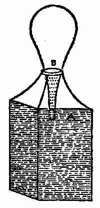 A single hand vacuum cleaner can be made from a powerful suction pump, as indicated in the sketch Fig. 214. This should be connected with a metallic box by means of a flexible armoured rubber hose, covered at the end with a piece of fine wire gauze to prevent large particles of dust, etc., being drawn into the pump. To another opening of the box should be fastened another flexible rubber tube, with a bell-shaped metal attachment at the end. The bell-shaped arrangement should be held closely to the carpet while the pump is in action. Within the box, the pipe to which the pump is attached should be bent upward, so that the rush of air shall not bring the dust with it; the object being to collect the dust in the box. A lid covers the box so that it can [379] be emptied from time to time. The success of this arrangement depends on the strength of the pump; if it be a weak one, the inrush of air through the funnel will be so slight that the dust will not be raised.
