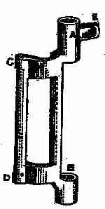 Secure an air-tight tin about 8 inches in diameter and 12 inches high, and fasten it to the base board, as shown at J, Fig. 218. The cover of a coffee tin should now be soldered over the inlet valve, as shown at K, Fig. 219. Solder a hose connection in the centre of this cover, also one in the side of the tin, as shown at L, Fig. 218. Couple a short piece of hose M to these connections. The strainer S should be made of very strong and closely woven [385] unbleached drill. Make it in the form of bag with a 1-inch hem at the top, and place it in the tin, as shown by the dotted line, the hem fitting closely over the inside edge of the tin. The cover of the tin is made from a flat pine board about one inch thick, and is held in place by two 1⁄4-inch rods fastened in the base board. These rods have thumb nuts on the top, which allow the cover to be readily removed or tightened down. It is best to place a rubber or leather gasket between the cover and the edge of the tin so as to make an air-tight joint.