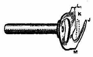 A diagrammatic plan of the eight horse-power, single-cylinder chassis is shown in the accompanying illustration (Fig. 226) in which, A indicates parts enclosed, taking the mixture of gasolene and air from the float-feed spray carburetor B, which has an automatic air regulator. The purpose of this last device is to dilute the mixture when the engine has a light load and is inclined to race; generally speaking, this regulator serves to proportion the ingredients of the explosive mixture to the requirements of the engine. Current O for the ignition of the [398] explosive mixture (ignition occurs once for every two revolutions of the fly-wheel), is supplied by an accumulator and intensified by a high-tension coil. The products of combustion pass through the exhaust pipe C to the muffler D, from which they pass to the atmosphere through a series of fine holes. The starting handle E makes a simple connection with the end of the motor shaft F when required. G is the fly-wheel. The drive from the engine is through a universal joint H to the change-speed gear J, the latter consisting of two trains of toothed wheels, a big wheel on the primary shaft gearing with a small one on the secondary shaft to give a high speed, and vice versa. From the change-speed gear, the drive is through a shaft K, having a universal joint L at each end, to the bevel gearing above the differential gear of the live rear axle. Bevel gears and the differential gear are all contained in the casings M. Three brakes are fitted, one operated by pedal, working on a drum N secured to the propeller shaft, the others operated by the side lever and working on drums O O, secured to the rear wheels. The change-speed gear gives three speeds forward and a reverse; the frame is of pressed steel; the rod and wheels are of the artillery type and carry 700 mm. by 85 mm. pneumatic tires. The gasolene [400] tank holds 41⁄2 gallons, sufficient for 200 miles, and the lubricating oil tank holds 1 gallon, sufficient for 350 miles. Any beginner in motoring matters, who studies the diagram, will obtain a fair idea of the mechanism of the customary type of light car chassis.