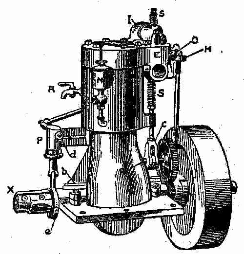 A view of a representative single-cylinder engine is shown at Fig. 225. The cam shaft is located at a and is driven by the gears which are shown just in the rear of the fly-wheel. At c are the cam and the roller, which actuates the exhaust valve. The cam consists of a collar with a flat projection or [395] toe upon its surface; the roller rests just above the surface of the collar, and is forced upward when struck by the projection. The roller is inserted to lessen the friction by rolling instead of rubbing. The valve stem extends upward into the valve chamber, and is encircled by the coiled spring e; the stem is guided by the guide at g. The exhaust is at E; I is the pipe leading from the vaporizer V to the inlet port in the valve chest. The inlet valve is directly below the spring S and is inverted, being held in place by the spring. The dome-shaped cap containing the inlet valve is removable for access to both valves. The complete cover is also removable. It will be observed that this engine has an open frame very similar to that of a steam engine, giving free access to the crank-pin and main bearings; the latter are shown fitted with oil boxes b instead of the grease cups, as there is no pressure tending to force the oil out along the shaft as in the two-cycle type. This open base not only makes the bearings more accessible, but renders it easier to lubricate them and keep them cool. At H is the ignition gear. P is the cooling water pump, run by the eccentric e. The suction is piped to d and the pump discharges through the pipe k into the cylinder. The outlet for the cooling water is at O; N is the [396] cylinder oil cup for oiling the bore of the cylinder. The compression cock R is for relieving the compression at starting. The coupling at X is for attaching the propeller shaft.