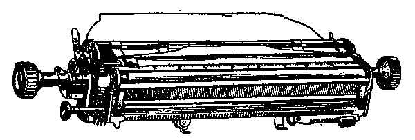 [406] The motive power is imparted by an adjustable coiled spring, a thin leather strap being fastened to it and the carriage, and the uniform space is governed by two clutches working on a rack. This rack is fixed on a rocking shaft, and derives a swinging motion from a universal bar fixed beneath the light wooden key levers.