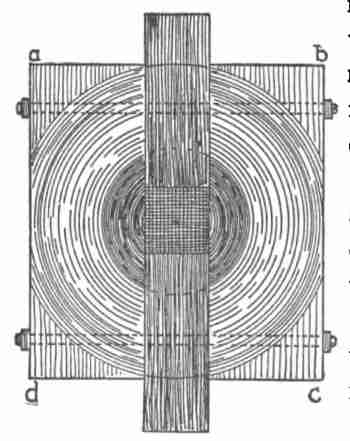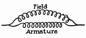 I opened and closed the switch, which sent the electric current through my magnet coils at frequent intervals, and the two boys, each with a compass needle, searched the field for magnetic effects. They found that the magnetic field extended six or eight feet, but this piece of research was broken up by a new idea which appeared to strike them both at the same instant, for they shouted both together,[17] "Let's use this electro-magnet in place of the bar magnet for our dynamo experiment!"
