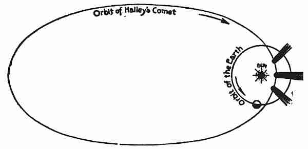 "Although Halley's comet has come within the earth's orbit about three thousand times since its first recorded appearance, I know of no man living who can give a satisfactory account of having seen it. Any one who has seen it before must be at least seventy-five years old, for it requires seventy-five years to make one complete circuit of its own orbit. But no one who is now seventy-five could have observed it intelligently, and even one who is now eighty-five years old would have to tell what he saw when he was ten years old and has remembered for seventy-five years. Furthermore, any account of how it looked on a former return is no guide to how it may appear on this trip. You may properly think of the comet as a group of solid pieces no bigger than the stones you may throw, scattered, two or three to the mile, through a space 12,500 miles broad. This extremely thin cloud of particles does not reflect enough sunlight to be visible, even in a telescope, in any part of its journey, and hence we should be wholly unaware of its existence if it did not sometimes have the strange faculty of giving out light of its own while in that part of its own orbit nearest to the sun. At such a time there is a hazy light enveloping the mass of small bodies, and streaming away sometimes many[335] million miles from them. The mass of small bodies is generally referred to as the nucleus, and the stream of luminous gas which the nucleus gives forth is called the tail, though it reminds me more of a search-light.