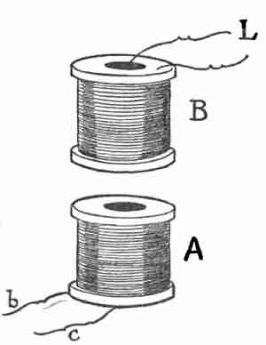 In my first experiment on that occasion I took a one-pound spool of No. 24 cotton-covered copper[350] wire and crowded the hole in the spool full of wire nails A (Fig. 198). I disconnected the wires from an electric drop lamp and connected them to b and c, the ends of the wire from the spool. Our electric lighting circuit was what is called the alternating current. I also had a second spool, B, precisely like the first. The wires from this were connected to a miniature lamp, L, such as is used at the switchboard of a telephone exchange. We then screwed the drop-light plug into the chandelier and turned on the electric current. I brought spool B with the miniature lamp near to spool A, as shown in Fig. 199, and when it was within a distance of about two inches the little lamp lighted up to full brilliancy, thus showing that while the electric current is passing in the wire of spool A its influence is not confined to the wire, but exhibits itself in the region outside of the wire. To illustrate still further this fact we substituted an electric bell in the place of the lamp L, and when the spool B was brought near to A the bell rang. But the most striking illustration was obtained when a telephone receiver was put in the place of L. With this held to the ear while the spool B was brought toward A a humming sound could be heard when B was about a foot distant from A. This sound grew rapidly[351] louder as B approached A, until, when the spool B rested upon the spool A, a sound like the peal of a pipe organ was heard all over the apartment. The tone was very nearly that of the key on the piano which is two octaves below middle C. I unscrewed the cap on the large end of the telephone receiver, took it off, and moved the thin iron diaphragm to one side, when it began to dance about at great speed. It was keeping time with the dynamo, five miles away, which generated the electric current. The dynamo changed the direction of the electric current sixty times per second, and this made sixty vibrations per second. The dynamo sent out ether waves which affected the telephone receiver, although the receiver was not connected to the dynamo by wires.