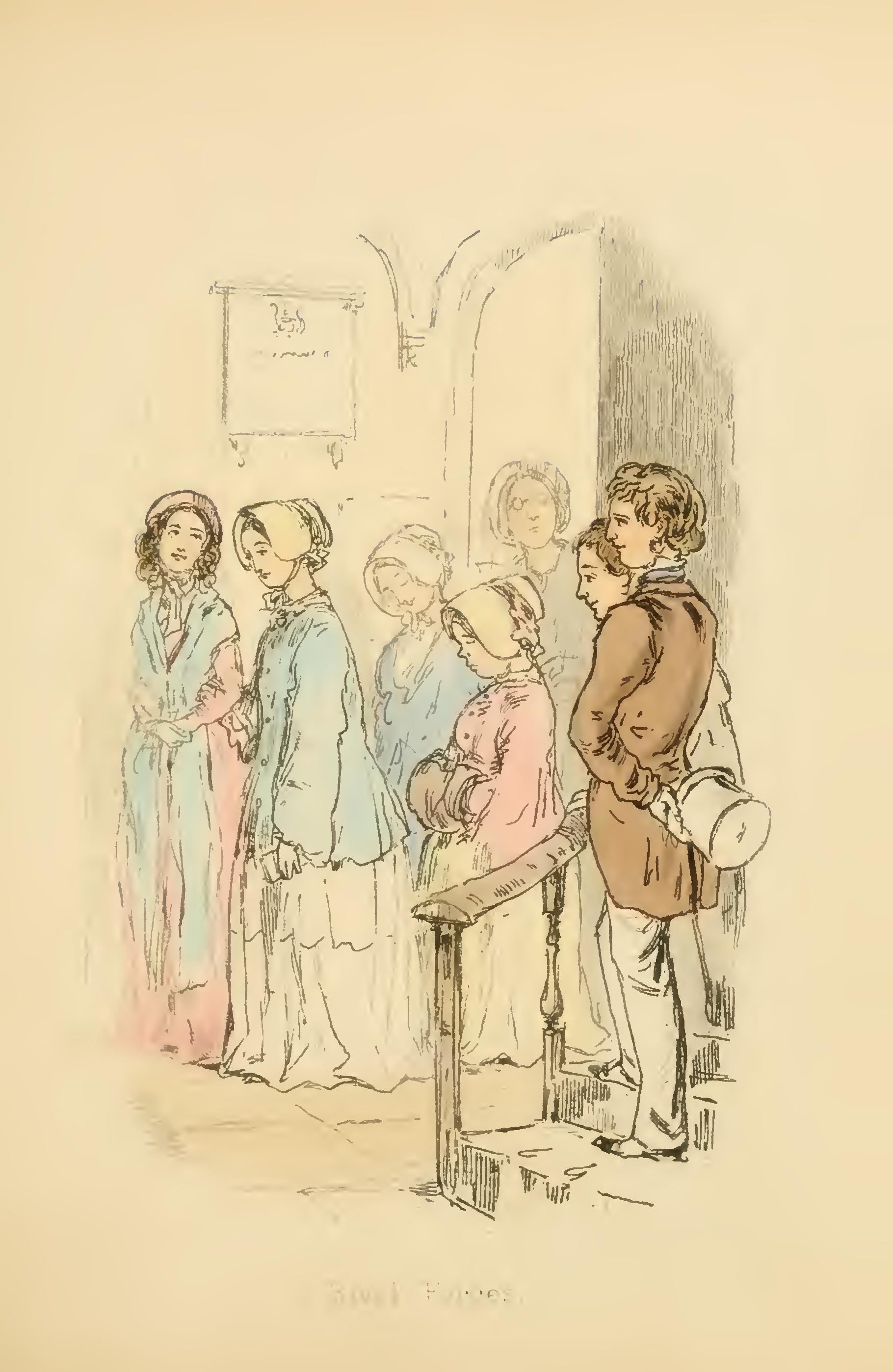 If he is a good-hearted boy, as I have reason to think, the very first thing he will do, before inspecting the contents of the hamper, or cutting into them with the knife which Master Brown has so considerately lent him; will be to read over the letter from home which lies on the top of the parcel. He does so, as I remark to Miss Raby (for whom I happened to be mending pens when the little circumstance arose), with a flushed face and winking eyes. Look how the other boys are peering into the basket as he reads.—I say to her, "Isn't it a pretty picture?" Part of the letter is in a very large hand. That is from his little sister. And I would wager that she netted the little purse which he has just taken out of it, and which Master Lynx is eyeing.