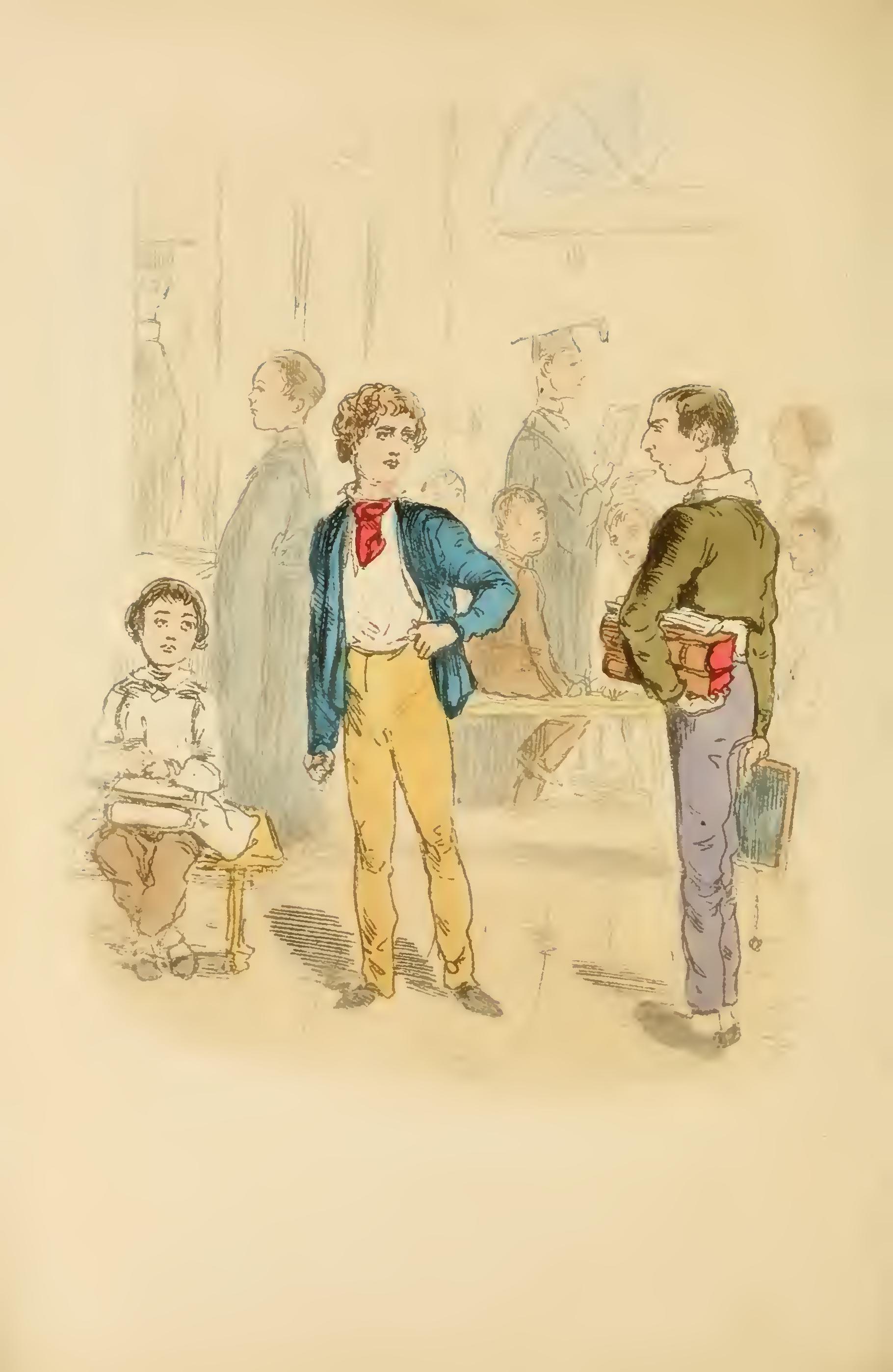 By the way, I have forgotten to mention the Doctor himself. And what shall I say of him? Well, he has a very crisp gown and bands, a solemn air, a tremendous loud voice, and a grand and solemn air with the boys' parents, whom he receives in a study, covered round with the best bound books, which imposes upon many—upon the women especially—and makes them fancy that this is a Doctor indeed. But, Law bless you! He never reads the books; or opens one of them, except that in which he keeps his bands—and a Dugdale's Monasticon, which looks like a book, but is in reality a cupboard, where he has his almond cakes, and decanter of port wine. He gets up his classics with translations, or what the boys call cribs. They pass wicked tricks upon him when he hears the forms. The elder wags go to his study, and ask him to help them in hard bits of Herodotus or Thucydides: he says he will look over the passage, and flies for refuge to Mr. Prince, or to the crib.
