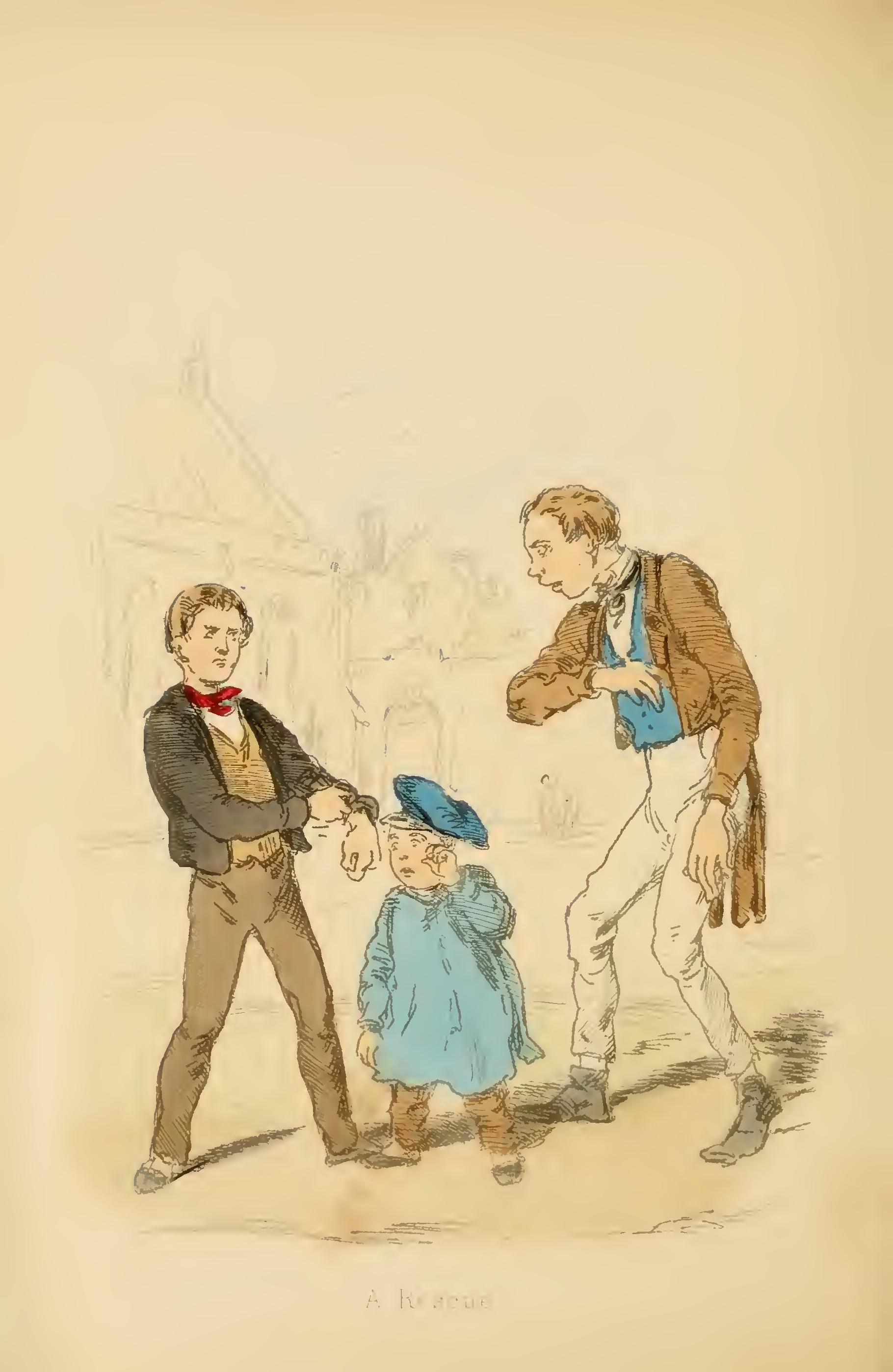 Like all great men, George is good-humoured and lazy. There is a particular bench in the play-ground on which he will loll for hours on half-holidays, and is so affable that the smallest boys come and speak to him. It is pleasant to see the young cubs frisking round the honest lion. His chief friend and attendant, however, is young Jack Hall, whom he saved when drowning, out of the Miller's Pool. The attachment of the two is curious to witness. The smaller lad gambolling, playing tricks round the bigger one, and perpetually making fun of his protector. They are never far apart, and of holidays you may meet them miles away from the school. George sauntering heavily down the lanes with his big stick, and little Jack larking with the pretty girls in the cottage windows.