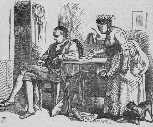 By various means he made a shift to live. At one time he pounded drugs for an apothecary near London Bridge; at another, he attempted to practise physic amongst the poorest of the poor. Now we find him correcting press proofs for a printer; and now he is settled for a time as usher in Dr. Milner's boys' school at Peckham. We have a picture of him here, drawn by Miss Milner, the principal's daughter. He is described as exceedingly good-natured, always ready to amuse the boys with his flute, giving away his money, or spending it in tarts and sweetmeats for the boys as soon as he received it, and generally recommending himself by his amiability and kindliness of heart. But Goldsmith himself considered this servitude at the Peckham Academy as the most dreary period of his life. The position of an usher was at that time, if possible, worse than it is now; and the mortifications he experienced at Peckham helped to throw a shadow over his later life.