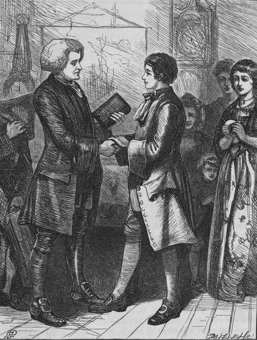 The book thus sold for sixty pounds was the "Vicar of Wakefield," a work never surpassed for wonderful vitality of character and for beauty of colouring. The old vicar, loveable in his very weakness, and indulgent as a Christian priest should be towards the weaknesses of others—the downright honest buxom wife, whose maternal vanity at times tempts her so sorely to disobedience against the behests of her lord and master—Olivia the coquette, and Sophia the prude—Moses the honest and simple—and Burchell with his grand monosyllabic commentary of "Fudge,"—these will live so long as English Literature lasts, and be remembered with delight when the pretentious effusions of the Richardson school have vanished into the limbo of obscurity. But the outcry that has since been raised against the bookseller who only gave sixty pounds for the manuscript appears somewhat unjust. Francis Newbery gave the sum demanded by Johnson, evidently without reading the book, and on Johnson's recommendation alone. That he had no great hopes of profit from his bargain is proved by the length of time he allowed it to lie unpublished in his desk. It was not Newbery's fault that the manuscript was sent out at a pinch, to be sold for what it would bring, before it had even been read to a few discerning friends who might have given a deliberate opinion on its merits. Johnson spoke sensibly enough when he replied to the indignant protest,—" A sufficient price, too, when it was sold; for then the fame of Goldsmith had not been elevated, as it afterwards was, by his 'Traveller;' and the bookseller had faint hopes of profit by his bargain. After the 'Traveller,' to be sure, it was accidentally worth more money."