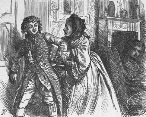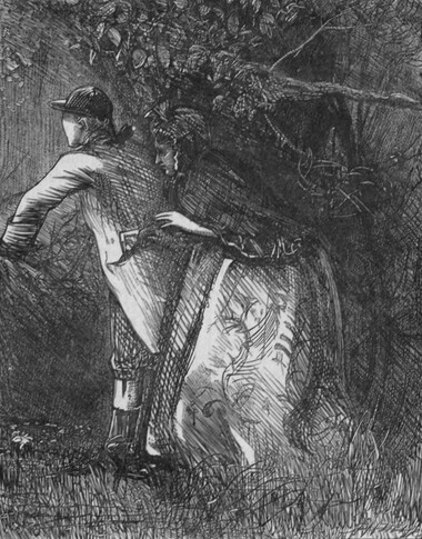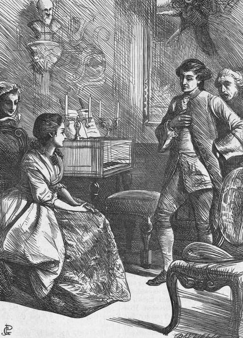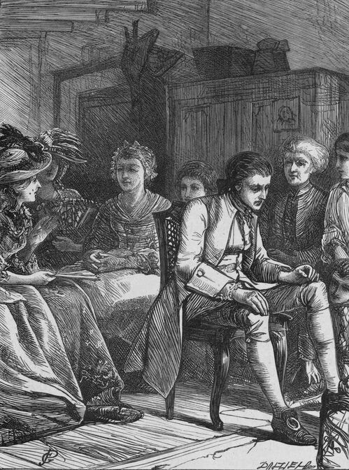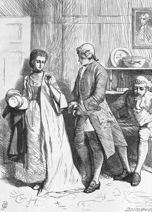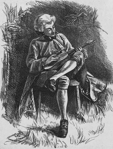 It was about the beginning of autumn, on a holiday—for I kept such as intervals of relaxation from labour—that I had drawn out my family to our usual place of amusement, and our young musicians began their usual concert. As we were thus engaged, we saw a stag bound nimbly by, within about twenty paces of where we were sitting, and, by its panting, it seemed pressed by the hunters. We had not much time to reflect upon the poor animal's distress, when we perceived the dogs and horsemen come sweeping along at some distance behind, and making the very path it had taken. I was instantly for returning in with my family; but either curiosity or surprise, or some more hidden motive, held my wife and daughters to their seats. The huntsman, who rode foremost, passed us with great swiftness, followed by four or five persons more, who seemed in equal haste. At last, a young gentleman, of a more genteel appearance than the rest, came forward, and for a while regarding us, instead of pursuing the chase stopped short, and, giving his horse to a servant who attended, approached us with a careless, superior air. He seemed to want no introduction, but was going to salute my daughters as one certain of a kind reception; but they had early learned the lesson of looking presumption out of countenance. Upon which he let us know that his name was Thornhill, and that he was the owner of the estate that lay for some extent around us. He again, therefore, offered to salute the female part of the family; and such was the power of fortune and fine clothes, that he found no second repulse. As his address, though confident, was easy, we soon became more familiar; and perceiving musical instruments lying near, he begged to be favoured with a song. As I did not approve of such disproportioned acquaintances, I winked upon my daughters in order to prevent their compliance; but my hint was counteracted by one from their mother, so that with a cheerful air they gave us a favourite song of Dryden's. Mr. Thornhill seemed highly delighted with their performance and choice, and then took up the guitar himself. He played but very indifferently; however, my eldest daughter repaid his former applause with interest, and assured him that his tones were louder than even those of her master. At this compliment he bowed, which she returned by a curtsey. He praised her taste, and she commended his understanding: an age could not have made them better acquainted: while the fond mother too, equally happy, insisted upon her landlord's stepping in, and taking a glass of her gooseberry. The whole family seemed earnest to please him: my girls attempted to entertain him with topics they thought most modern; while Moses, on the contrary, gave him a question or two from the ancients, for which he had the satisfaction of being laughed at; my little ones were no less busy, and fondly stuck close to the stranger. All my endeavours could scarcely keep their dirty fingers from handling and tarnishing the lace on his clothes, and lifting up the flaps of his pocket-holes, to see what was there. At the approach of evening he took leave; but not till he had requested permission to renew his visit, which, as he was our landlord, we most readily agreed to.