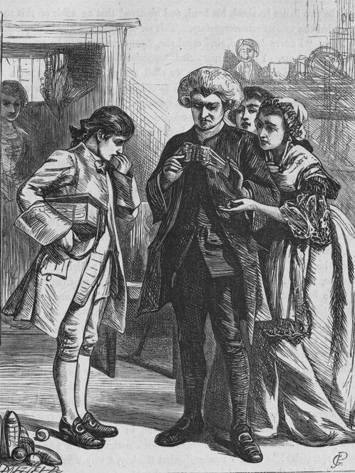 The temper of a woman is generally formed from the turn of her features; at least it was so with my daughters. Olivia wished for many lovers; Sophia to secure one. Olivia was often affected, from too great a desire to please; Sophia even repressed excellence, from her fear to offend. The one entertained me with her vivacity when I was gay, the other with her sense when I was serious. But these qualities were never carried to excess in either, and I have often seen them exchange characters for a whole day together. A suit of mourning has transformed my coquette into a prude, and a new set of ribands has given her younger sister more than natural vivacity. My eldest son, George, was bred at Oxford, as I intended him for one of the learned professions. My second boy, Moses, whom I designed for business, received a sort of miscellaneous education at home. But it is needless to attempt describing the particular characters of young people that had seen but very little of the world. In short, a family likeness prevailed through all; and, properly speaking, they had but one character—that of being all equally generous, credulous, simple, and inoffensive.