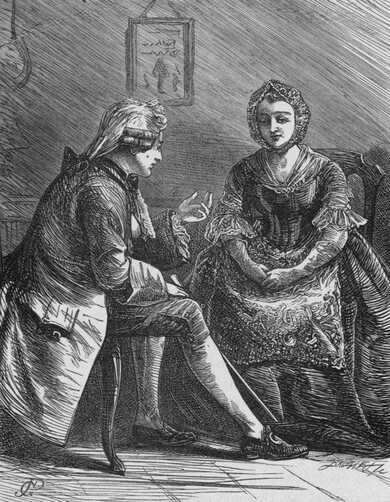 "Distressed, but not discouraged at this treatment, he was at last resolved to find that assistance from love, which he could not have from friendship. Miss Jenny Dismal had a fortune in her own hands, and she had already made all the advances that her sex's modesty would permit. He made his proposal, therefore, with confidence, but soon perceived, 'No bankrupt ever found the fair one kind.' Miss Jenny and Master Billy Galoon were lately fallen deeply in love with each other, and the whole neighbourhood thought it would soon be a match.