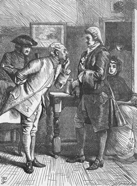 But the wish to relieve was so largely in excess of the power, that frequently when Justice called to present a claim for payment Generosity had been beforehand, and had carried away the money; and Justice had to wait, or, alas, in too many cases, to go away unsatisfied. Thus the most humiliating position in which Goldsmith was ever placed in the days of his direst poverty, arose from his hastily obeying an impulse to relieve the landlord of his miserable lodgings, who had been arrested for debt, and whose wife came to Goldsmith, weeping and wringing her hands. Thinking only how he could liberate the poor man by the only means in his power, the poet rushed off and pledged some books, and a suit of clothes, procured on the credit of Ralph Griffiths, a bookseller, that Goldsmith might appear decently at an examination, which he failed to pass, and dire was the wrath of Griffiths on the occasion.