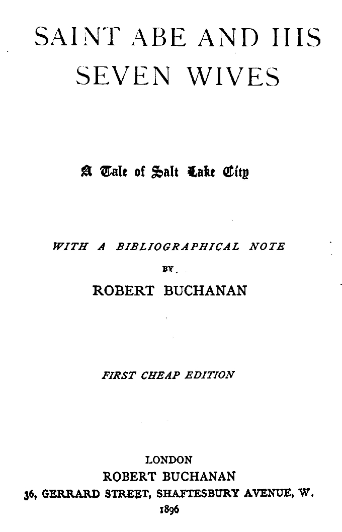 I cannot conclude this bibliographical note without a word concerning the remarkable artist who furnished St. Abe and his Seven Wives with its original frontispiece. The genius of the late A. B. Houghton is at last receiving some kind of tardy recognition, chiefly through the efforts of Mr. Pennell, whose criticisms on art have done so much to free the air of lingering folly and superstition. When I sought out Mr. Houghton, and persuaded him to put pencil to paper on my behalf, he was in the midst of his life-long struggle against the powers of darkness. He died not long afterwards, prematurely worn out with the hopeless fight. One of the last of the true Bohemians, a man of undoubted genius, he never learned the trick of wearing fine linen and touting for popularity; but those who value good work hold him in grateful remembrance, and I am proud to think that so great a master in black and white honoured me by associating himself with a book of mine.
