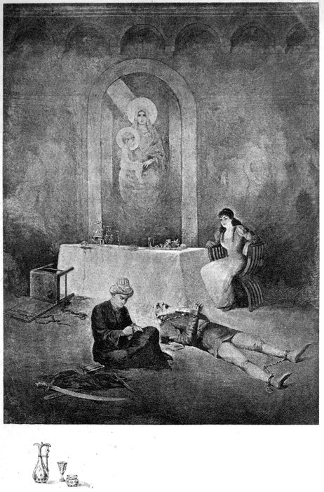She said, It hath reached me, O auspicious King, that Al-Hajjaj said to the Captain of the watch, “There is no help for it but thou send out horsemen, and look for the damsel on all the roads and seek for her in the towns.” Then he turned to Ni’amah and said to him, “An thy slave-girl return not, I will give thee ten slave-girls from my house and ten from that of the Chief of Police.” And he again bade the Captain of the Watch, “Go and seek for the girl.” So he went out, and Ni’amah returned home full of trouble and despairing of life; for he had now reached the age of fourteen and there was yet no hair on his side-cheeks. So he wept and lamented and shut himself up from his household; and ceased not to weep and lament, he and his mother, till the 10morning, when his father came in to him and said, “O my son, of a truth, Al-Hajjaj hath put a cheat upon the damsel and hath taken her; but from hour to hour Allah giveth relief.” However grief redoubled on Ni’amah, so that he knew not what he said nor knew he who came in to him, and he fell sick for three months; his charms were changed, his father despaired of him and the physicians visited him and said, “There is no remedy for him save the damsel.” Now as his father was sitting one day, behold, he heard tell of a skilful Persian physician, whom the folk gave out for perfect in medicine and astrology and geomancy. So Al-Rabi’a sent for him and, seating him by his side, entreated him with honour and said to him, “Look into my son’s case.” Thereupon quoth he to Ni’amah, “Give me thy hand.” The young man gave him his hand and he felt his pulse and his joints and looked in his face; then he laughed and, turning to his father, said, “Thy son’s sole ailment is one of the heart.”[12] He replied, “Thou sayest sooth, O sage, but apply thy skill to his state and case, and acquaint me with the whole thereof and hide naught from me of his condition.” Quoth the Persian, “Of a truth he is enamoured of a slave-girl and this slave-girl is either in Bassorah or Damascus; and there is no remedy for him but reunion with her.” Said Al-Rabi’a, “An thou bring them together, thou shalt live all thy life in wealth and delight.” Answered the Persian, “In good sooth this be an easy matter and soon brought about;” and he turned to Ni’amah and said to him, “No hurt shall befal thee; so be of good cheer and keep thine eyes cool and clear.” Then quoth he to Al-Rabi’a, “Bring me out four thousand dinars of your money;” so he gave them to him, and he added, “I wish to carry thy son with me to Damascus; and Almighty Allah willing, I will not return thence but with the damsel.” Then he turned to the youth and asked, “What is thy name?”; and he answered “Ni’amah.” Quoth the Persian, “O Ni’amah, sit up and be of good heart, for Allah will reunite thee with the damsel.” And when he sat up the leach continued, “Be of good cheer for we set out for Damascus this very day: put thy trust in the Lord, and eat and drink and be cheerful so as to fortify thyself for travel.” Upon this the Persian began making preparation of all things needed, such as presents and rarities; and he took of 11Al-Rabi’a in all the sum of ten thousand dinars, together with horses and camels and beasts of burden and other requisites. Then Ni’amah farewelled his father and mother and journeyed with the physician to Aleppo. They could find no news of Naomi there, so they fared on to Damascus, where they abode three days, after which the Persian took a shop and he adorned even the shelves with vessels of costly porcelain, with covers of silver, and with gildings and stuffs of price. Moreover, he set before himself vases and flagons of glass full of all manner of ointments and syrups, and he surrounded them with cups of crystal and, placing astrolabe and geomantic tablet facing him, he donned a physician’s habit and took his seat in the shop. Then he set Ni’amah standing before him clad in a shirt and gown of silk and, girding his middle with a silken kerchief gold-embroidered, said to him, “O Ni’amah, henceforth thou art my son; so call me naught but sire, and I will call thee naught but son.” And he replied, “I hear and I obey.” Thereupon the people of Damascus flocked to the Persian’s shop that they might gaze on the youth’s goodliness and the beauty of the shop and its contents, whilst the physician spoke to Ni’amah in Persian and he answered him in the same tongue, for he knew the language, after the wont of the sons of the notables. So that Persian doctor soon became known among the townsfolk and they began to acquaint him with their ailments, and he to prescribe for them remedies. Moreover, they brought him the water of the sick in phials,[13] and he would test it and say, “He, whose water this is, is suffering from such and such a disease,” and the patient would declare, “Verily this physician sayeth sooth.” So he continued to do the occasions of the folk and they to flock to him, till his fame spread throughout the city and into the houses of the great. Now, one day as he sat in his shop, behold, there came up an old woman riding on an ass with a stuffed saddle of brocade embroidered with jewels; and, stopping before the Persian’s shop, drew rein and beckoned him, saying, “Take my hand.” He took her hand, and she alighted and asked him, “Art thou the Persian physician from Irak?” “Yes,” answered he, and she said, “Know that I have a sick daughter.” Then she brought out to him a phial and the Persian looked at it and said to her, “O my mistress, tell me thy 12daughter’s name, that I may calculate her horoscope and learn the hour in which it will befit her to drink medicine.” She replied, “O my brother the Persian,[14] her name is Naomi.”——And Shahrazad perceived the dawn of day and ceased saying her permitted say.