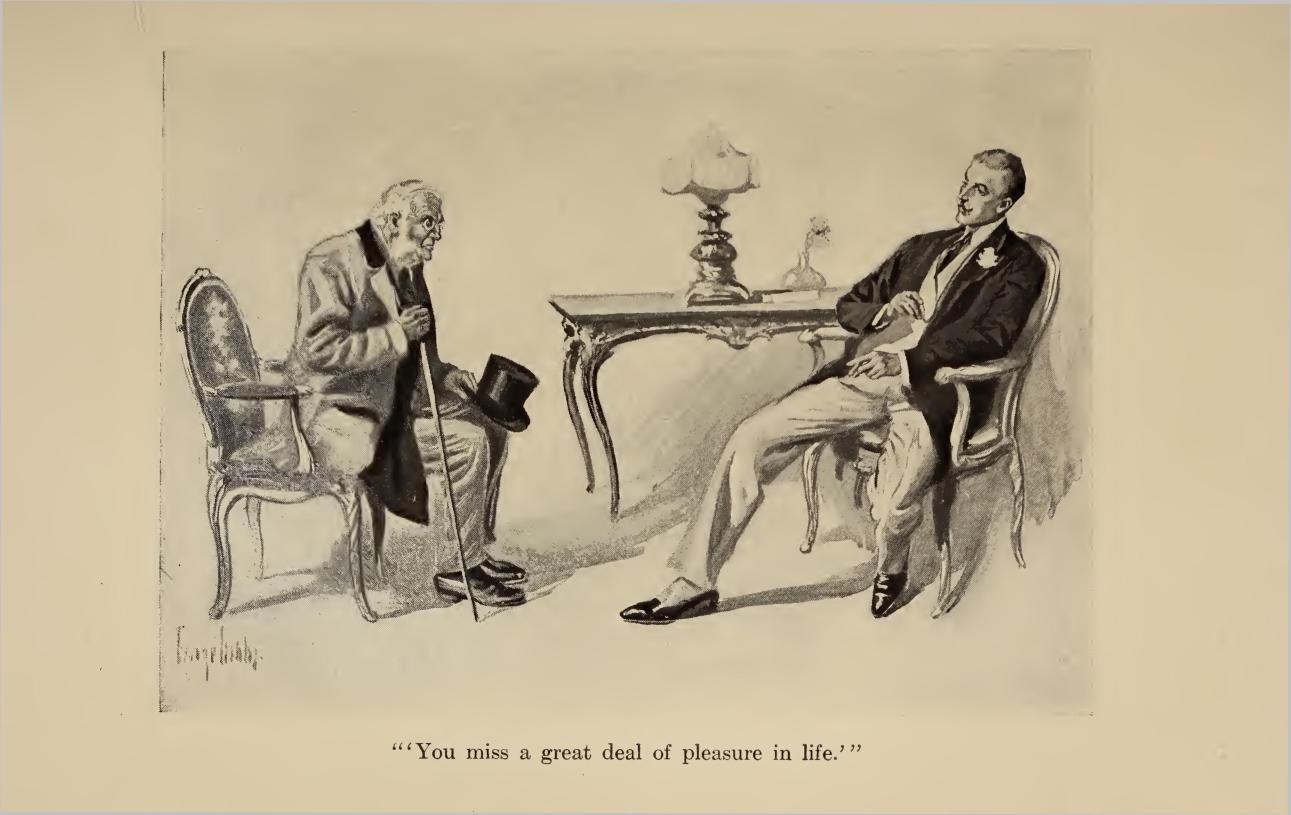 “Quite so. I am merely explaining. This firm attends to all the charities that are recognized in our set; the hospitals, the—well whatever they happen to be. When applied to personally in these matters, I write my name on the card of these solicitors, and forward it. Application is then made to them. They look into the matter, and save me the fatigue of investigation. The next firm”—holding up a second card—“deals with charities that are our of our purview; halfdays at the seaside, and that sort of thing. Now I come to business. This firm”—showing the third card—“looks after permanent investments, while this”—lifting the fourth—“takes charge of anything which is speculative in its nature. The applicant receives the particular card which pertains to his particular line of desire. He calls upon the estimable firm of solicitors, and either convinces them, or fails: gets his money, or doesn’t. So you see, my affairs are competently transacted, and I avoid the emotional strain of listening to explanations which probably I have not the mental grasp of business to understand. Now, which of these four cards may I have the pleasure of autographing for you?”
