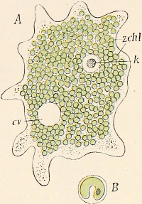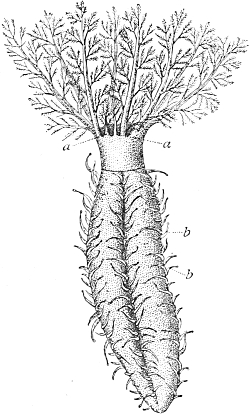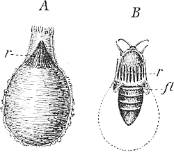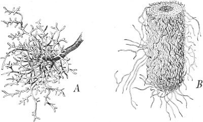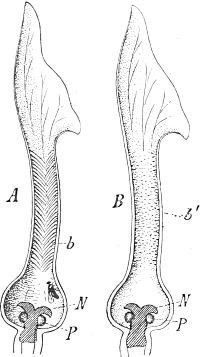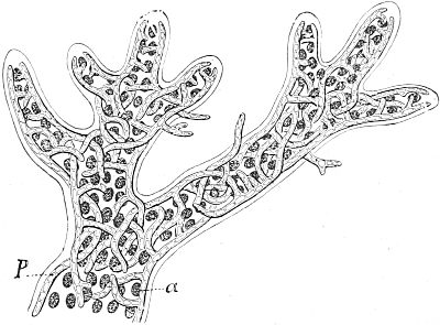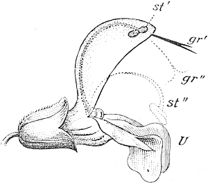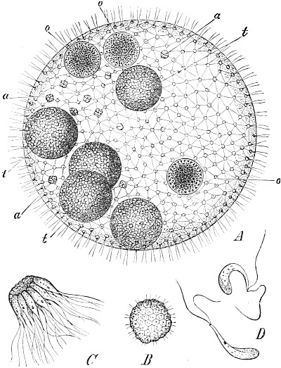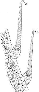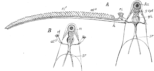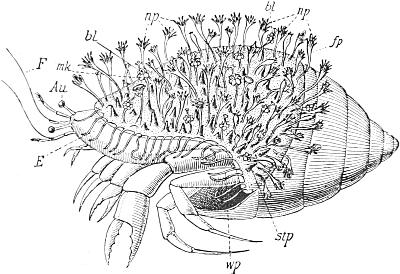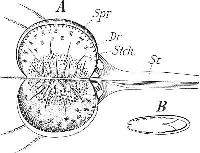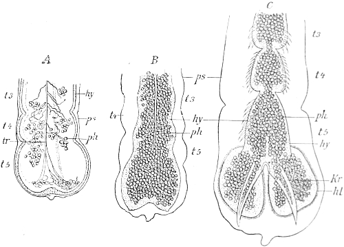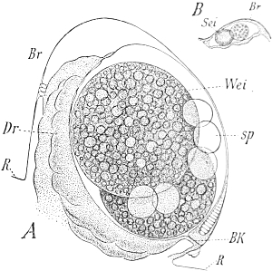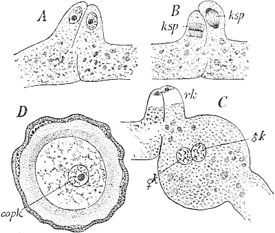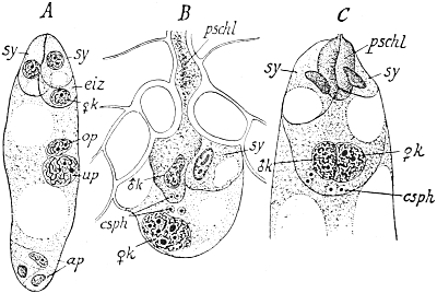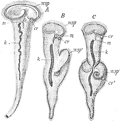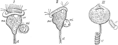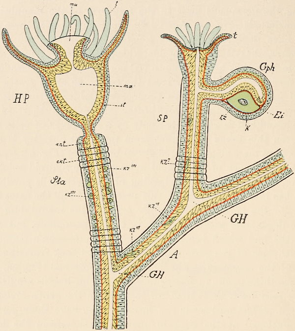 The adherence of the sexual animal to the hydroid colony has, however, made a more rapid ripening of the germ-cells possible, and nature has taken advantage of this possibility in all the cases known to me, for the germ-cells no longer arise in the manubrium of the mature degenerate medusoid, that is, of the gonophore, but earlier, before the bud which becomes a gonophore possesses a manubrium. The birthplace of the germ-cells is thus shifted back from the manubrium of the medusoid to the young gonophore-bud (Fig. 94, M, kz). The same thing occurs in species in which the medusoids are liberated, but live only for a short time, for instance, in the genus Podocoryne. Although perfect medusoids are formed, these have their germ-cells fully developed at the time of their liberation from the hydroid colony. But in species in which the medusoid-buds have really degenerated and are no longer liberated, the birthplace of the germ-cells is shifted even further back, and in the first place into the stalk (St, kz´´) of the polyp from the gonophore-buds. This is the case in the genus Hydractinia. In the further course of the process the birthplace of the germ-cells has shifted as far back as to the branch from which the polyp has grown out (Fig. 94, A, kz´´´); and finally, in the cases in which the medusoid has degenerated to a mere brood-sac (Fig. 95, Gph), even to the generation of polyps immediately before, that is, into the polyp-stem from which the branch arises that bears the polyps producing the gonophore-bud (Fig. 95, kz´´´). Then we find the birthplace of the germ-cells still further back (Fig. 95, kz´´´´), for the egg and sperm-cells arise in the stem of the principal polyps (the main stem of the colony). The advantage of this arrangement[Pg 414] is easily seen, for the principal polyp is present earlier than those of the secondary branches, and these again earlier than the polyp which bears the sexual buds, and this, finally, earlier than the sexual bud which it bears. Thus this shunting backwards of the birthplace of the germ-cells means an earlier origin of the primordium (Anlage) of the germ-cells, and consequently an earlier maturing of these.
