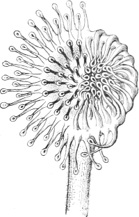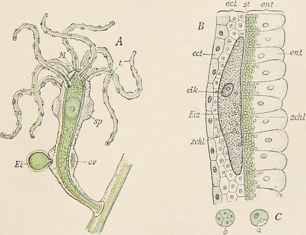 In the hydroid polyps and their medusoids the germ-cells always arise in the ectoderm; in species which produce sexual medusoids by budding, the germ-cells arise in the ectoderm of the manubrium of these medusoids (Fig. 94, M, kz). But in many species these sexual stages have degenerated in the course of phylogeny into so-called gonophores, that is, to medusoids which still exhibit more or less complete bells, but neither mouth (m) nor marginal tentacles (T), and which no longer break away from the colony to swim freely about, to feed independently, and to produce and ripen germ-cells. The degeneration of the 'gonophores' often goes even further; in many the medusoid bell is represented only by a thin layer of cells, and in some even this token of descent from medusoid ancestry is absent, and they are mere single-layered closed brood-sacs (Fig. 95, Gph).