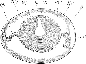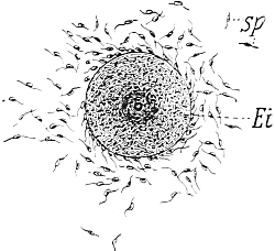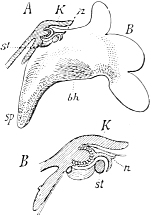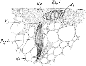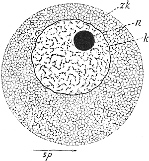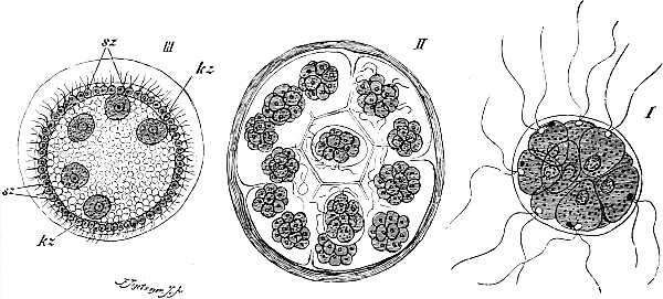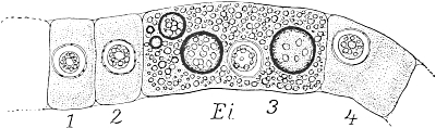The most interesting feature of this migration of the germ-cells is that the cells invariably arise in the ectoderm (kz´´´´), then pierce through the supporting lamella (st) into the endoderm (kz´´´), and then creep along it to their maturing-place. Once there they break through again to the outer layer of cells, the ectoderm (kz), and come to maturity (Ei). That they make their way through the endoderm is probably to be explained by the fact that they are there in direct proximity to the food-stream which flows through the colony (GH = gastric cavity), and they are thus more richly nourished there than in the ectoderm. But although this is the case, they never arise in the endoderm; in no single case is the birthplace of the germ-cells to be found in the endoderm, but always in the ectoderm, no matter how far back it may have been shunted. Even when the germ-cells migrate through the endoderm, their first recognizable appearance is invariably in the ectoderm, as, for instance, in Podocoryne and Hydractinia. The course of affairs is thus exactly what it would necessarily be if our supposition were correct, that only definite cell-generations—in this case the ectoderm-cells—contain the complete germ-plasm. If the endoderm-cells also contained germ-plasm it would be hard to understand why the germ-cells never arise from them, since their situation offers much better conditions for their further development than that of the ectoderm-cells. It would also be hard to understand why such a circuitous route was chosen as that exhibited by the migration of the young germ-cells into the endoderm. Something must be lacking in the endoderm that is necessary to make a cell into a germ-cell: that something is the germ-plasm.