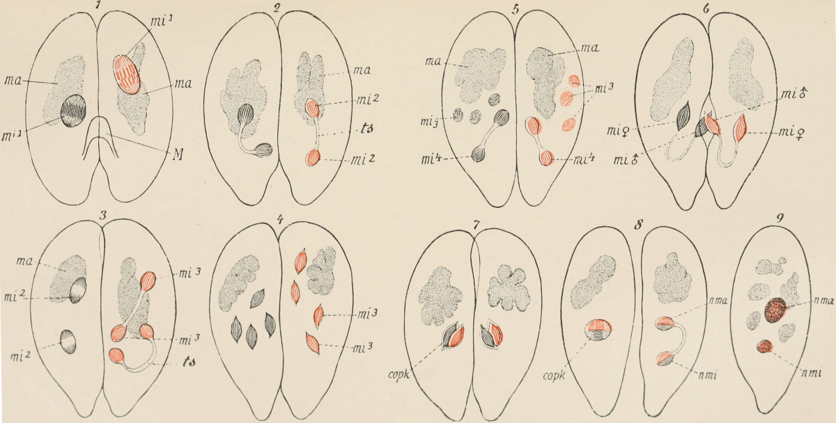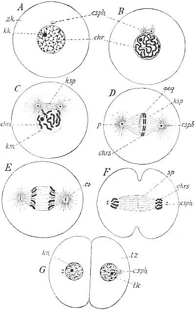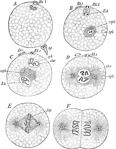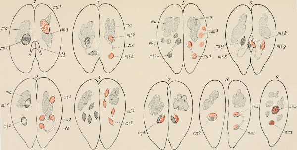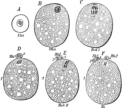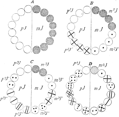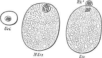 This splitting up of the substance of the ovum into a somatic half, which directs the development of the individual, and a propagative half, which reaches the germ-cells and there remains inactive, and later gives rise to the succeeding generation, constitutes the theory of the continuity of the germ-plasm, which I first stated in a work which appeared in the year 1885. Its fundamental idea had already been expressed much earlier by Francis Galton (1872), without however being fully appreciated at the time or having any influence on the course of science, and the same is true with the later theoretical views of Jäger, Rauber, and Nussbaum, all of whom reached the same idea quite independently of each other, and sought to elaborate it more or less fully.