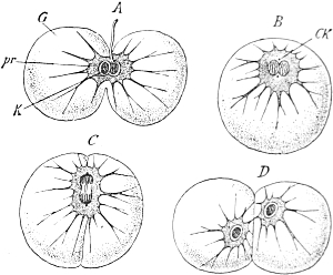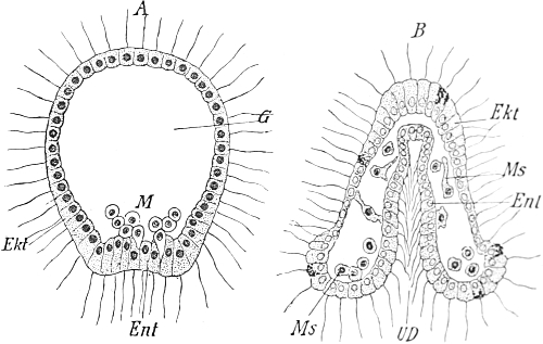 That isolated segmentation-cells have the capacity of developing into embryos which are complete but correspondingly smaller in size has been demonstrated in animals of various groups, though it does not seem to go to the same length in all. In the Medusæ we find that not only one of the first two, but one of the first four, eight, and even sixteen segmentation-cells may develop a whole larva when isolated (Zoja). In the sea-urchin at least any one of the first eight blastomeres may do so. And Driesch's experiments in cutting up the young larvæ at the blastula-stage (a single-layered ball of cells) leads us to assume that each of these cells still possesses the complete germ-plasm. Beyond that stage, however, the primary constituents obviously divide into those of the ectoderm and those of the endo[Pg 408]derm, for the subsequent two-layered stage in the sea-urchin's development, the gastrula, does not complete itself if it be artificially divided into fragments which consist only of cells from the outer, or only of cells from the inner layer. In corroboration of this experiment made by Barfurth, Samassa was able to demonstrate in regard to the egg of the frog that, even after the third division of the ovum, the segmentation-cells are so different from each other in respect of their primary constituents that they were not able to replace each other mutually. When this investigator killed the ectoderm-cells alone by means of an induction current, or the endoderm-cells alone, the dead half could not be replaced by the half which remained alive, and the whole ovum perished.