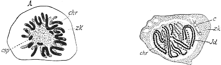 [24] Boveri has recently made an observation upon the thread-worm of the horse, which points to the correctness of the conception of the germ-plasm. The two first segmentation-cells both receive the four chromosomes of the species, but, in one of the two, a portion of the chromatin breaks off and degenerates, or dissolves, at least as far as can be seen. The other cell retains the whole mass of chromatin, and from this there arise later the primitive genital-cells. In the germ-track, therefore—so we must interpret it—the whole of the germ-plasm is retained, while a part of it is withdrawn from the soma. I have only partly described the process, and I do not wish to enter in detail on an interpretation of it, since it seems to me obscure and to require further observations before an interpretation can be attempted with any confidence.