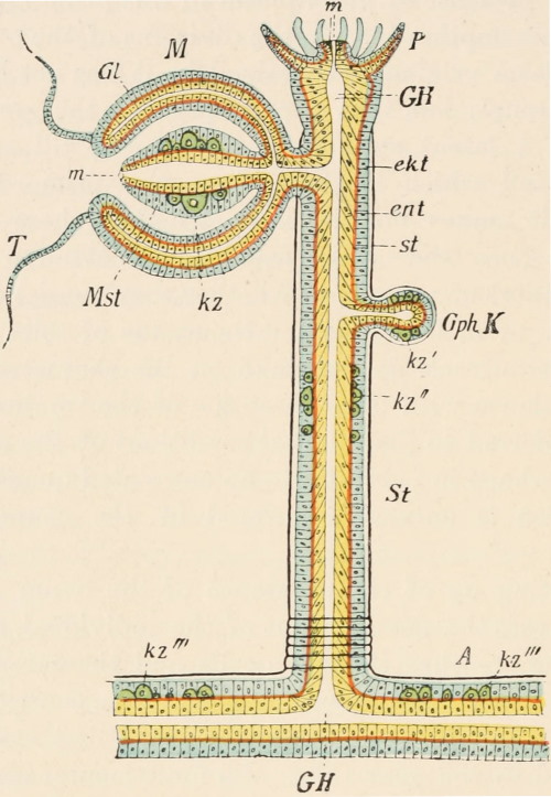 Fig. 94. Diagram to illustrate the phylogenetic shifting back of the origins of the germ-cells in medusoids and hydroids. A composite picture. A, branch of a polyp colony. P, polyp-head with mouth (m) and tentacles. St, stalk of the polyp. M, medusoid-bud with the bell (Gl). T, marginal tentacle. m, mouth. Mst, manubrium. GphK, a gonophore-bud. GH, gastric cavity. ekt, ectoderm. ent, endoderm. st, supporting lamella. The germ-cells (kz) arise in the medusoid in the ectoderm of the manubrium—first phyletic stage—where they also attain maturity. In the gonophore-bud (GphK) they arise in the ectoderm (kz´), or further down in the stalk of the polyp at kz´´—third phyletic stage, or in the ectoderm of the branch from which the polyp has arisen, at kz´´´—fourth phyletic stage of the shunting of the originative area of the germ-cells. In the two last cases the germ-cells migrate until they reach their primitive place of origination in the medusoid, or in the corresponding layer of the medusoid gonophore, as may be more clearly seen in Fig. 95. Drawn from my sketch by Dr. Petrunkewitsch.