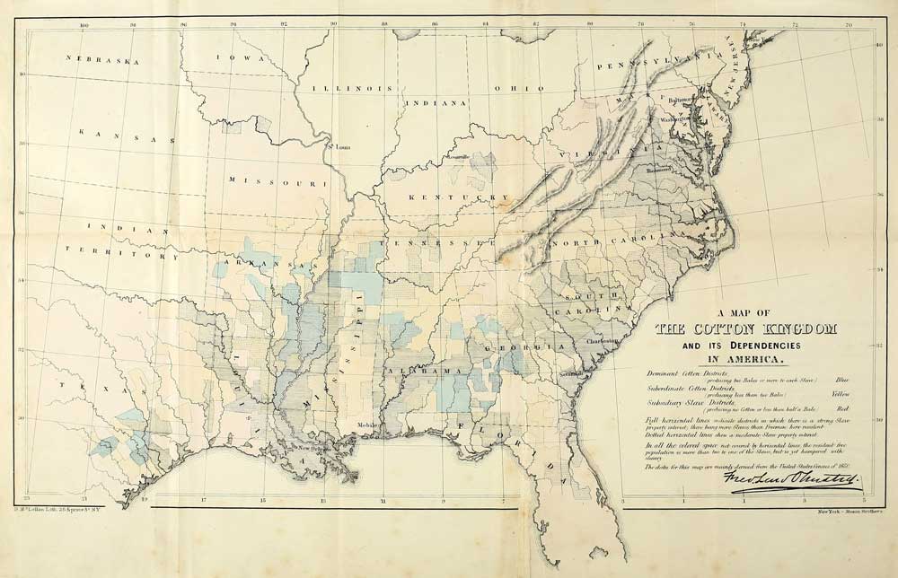 The Cotton Kingdom. A Traveller’s observations on Cotton and Slavery in the American Slave States. Based upon three former volumes of Journeys and Investigations by the same author. 2 vols., 12mo. pp. 384 and 408. With a Colored Statistical Map of the Cotton Kingdom and its Dependencies, mainly derived from the United States Census. Price, $2.00.