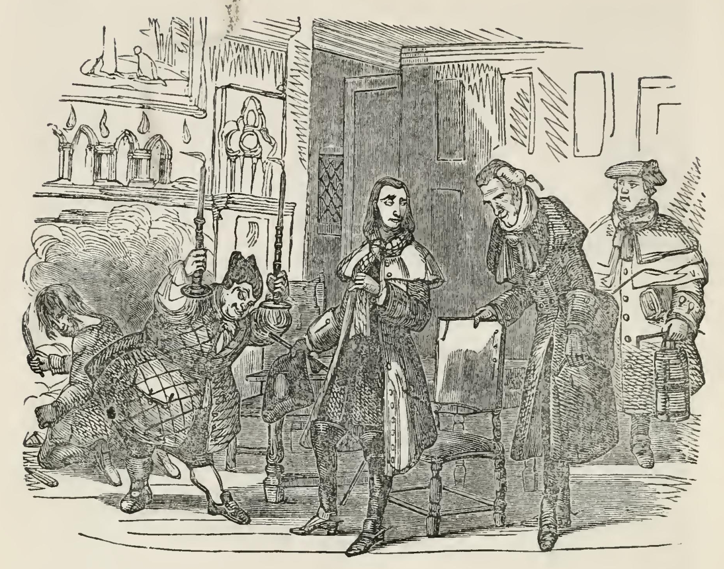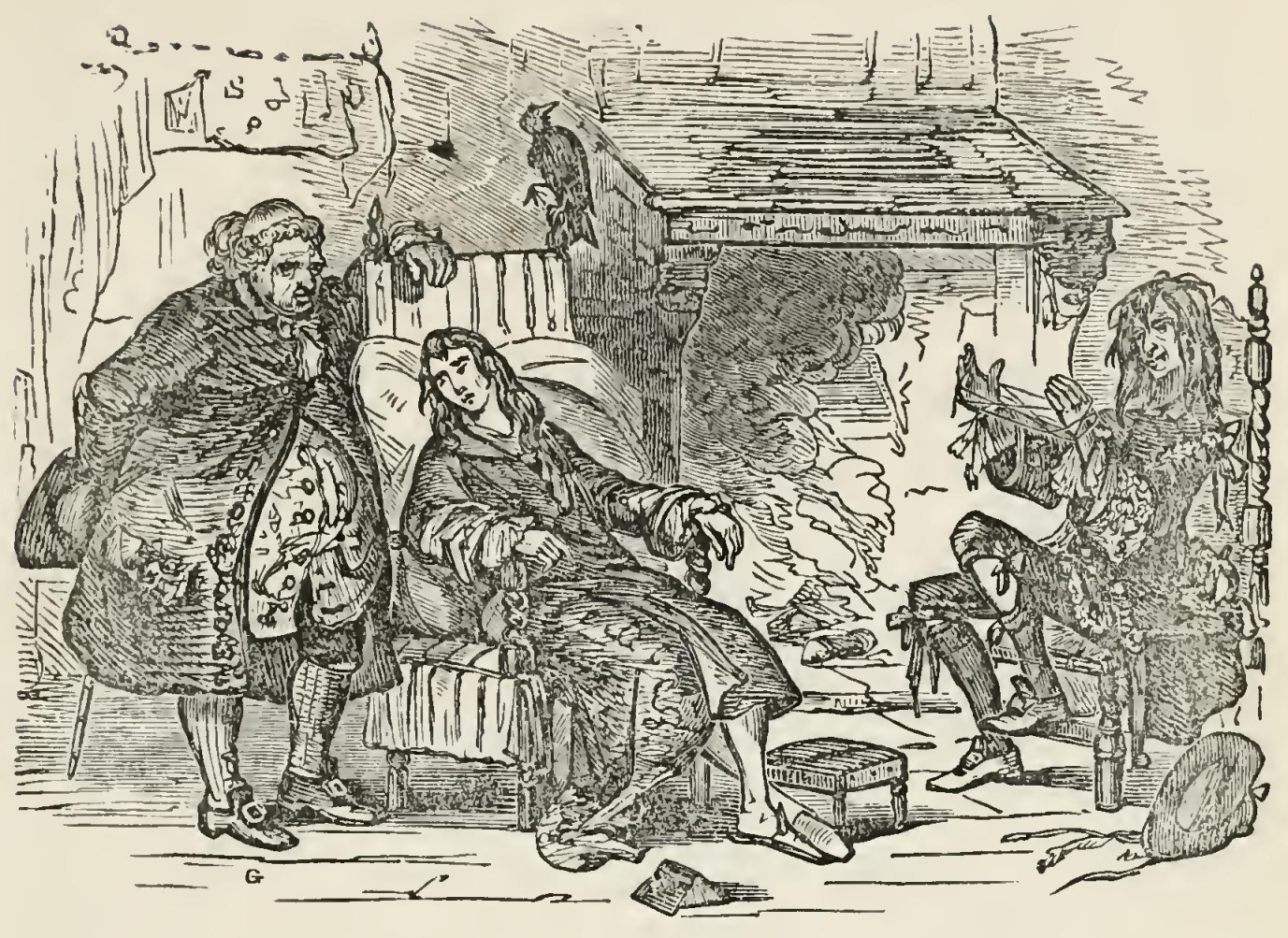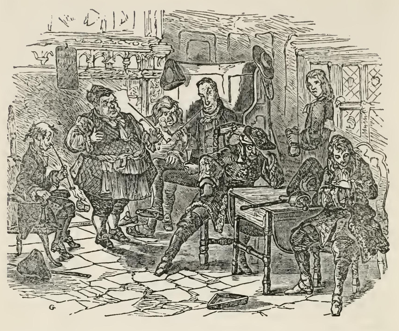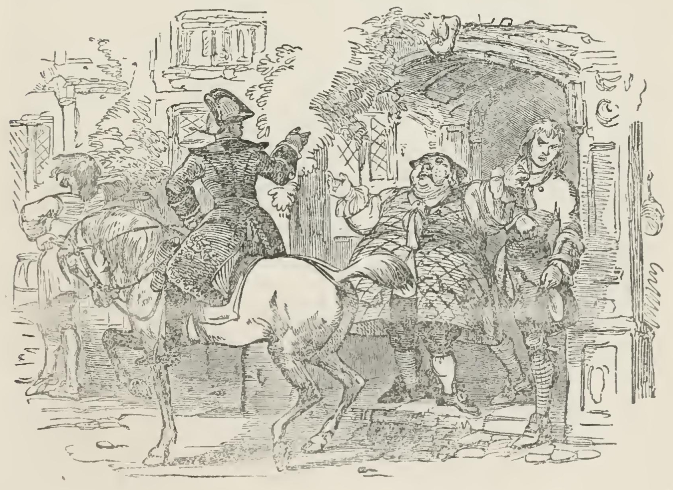 There was another guest, who sat, booted and spurred, at some distance from the fire also, and whose thoughts—to judge from his folded arms and knitted brows, and from the untasted liquor before him—were occupied with other matters than the topics under discussion or the persons who discussed them. This was a young man of about eight-and-twenty, rather above the middle height, and though of somewhat slight figure, gracefully and strongly made. He wore his own dark hair, and was accoutred in a riding dress, which together with his large boots (resembling in shape and fashion those worn by our Life Guardsmen at the present day), showed indisputable traces of the bad condition of the roads. But travel-stained though he was, he was well and even richly attired, and without being overdressed looked a gallant gentleman.