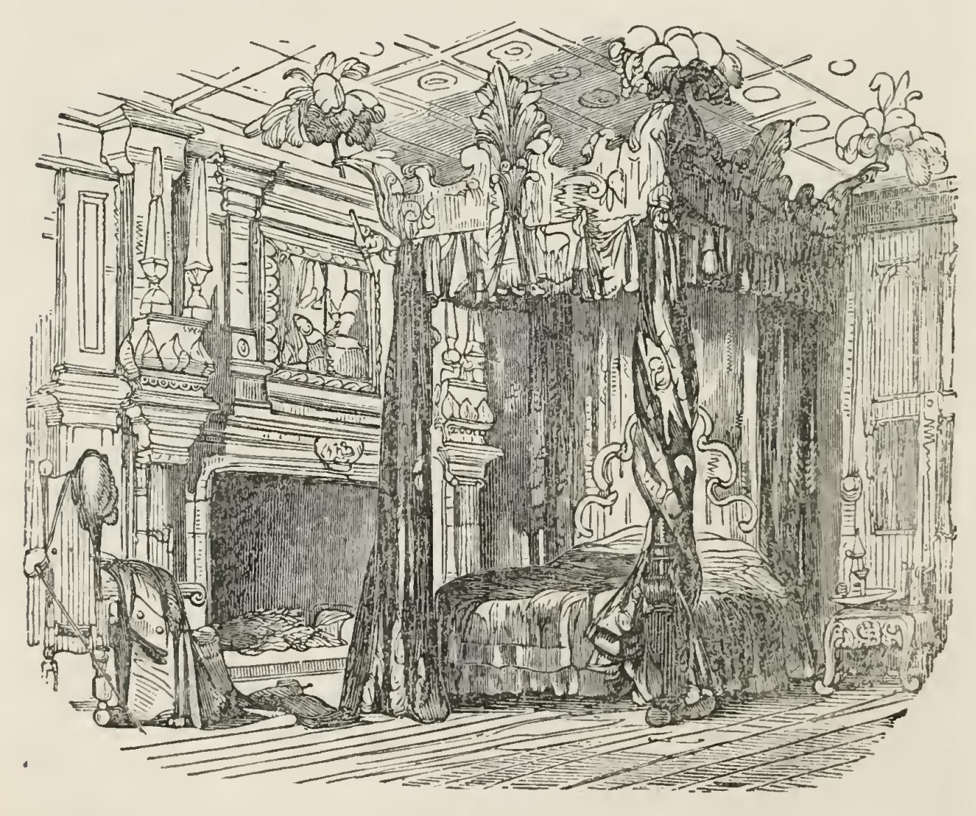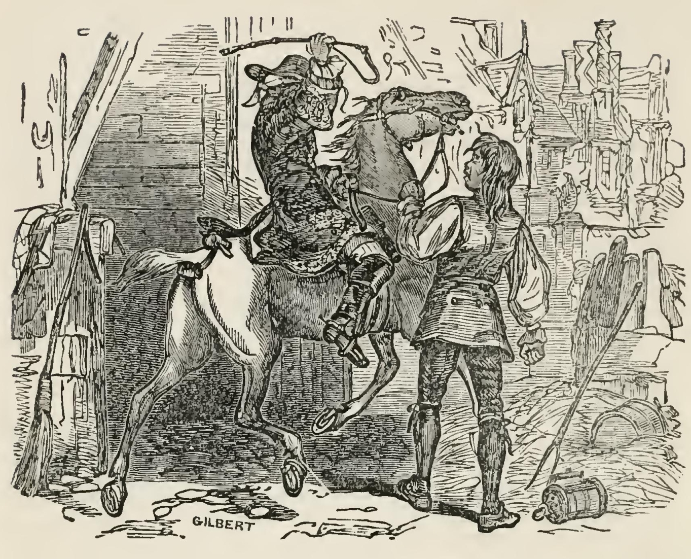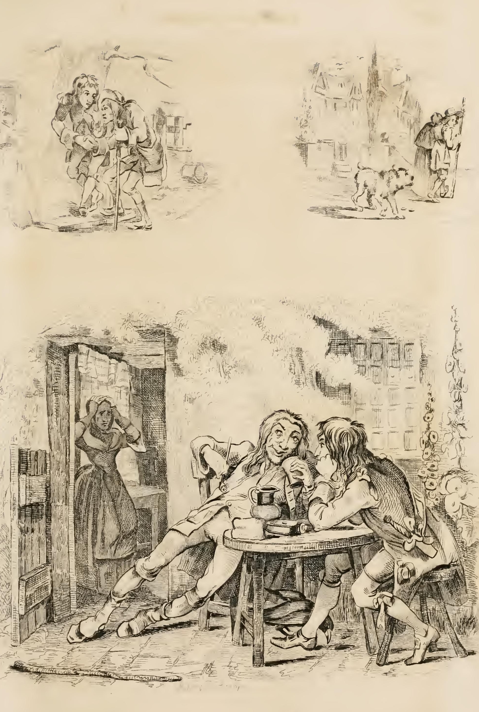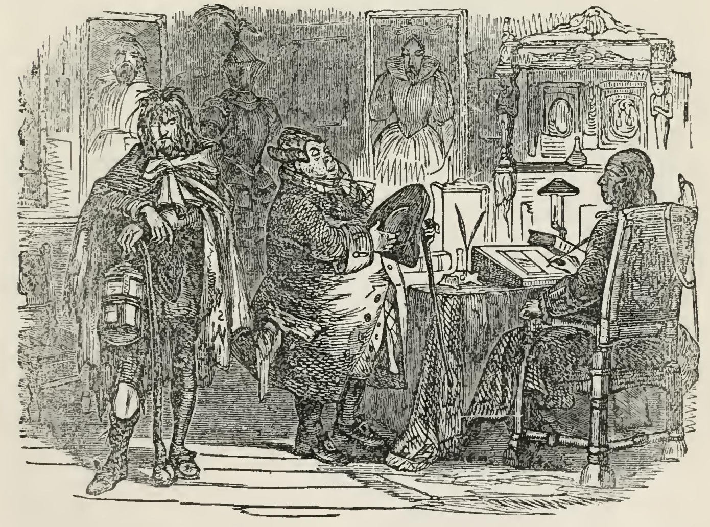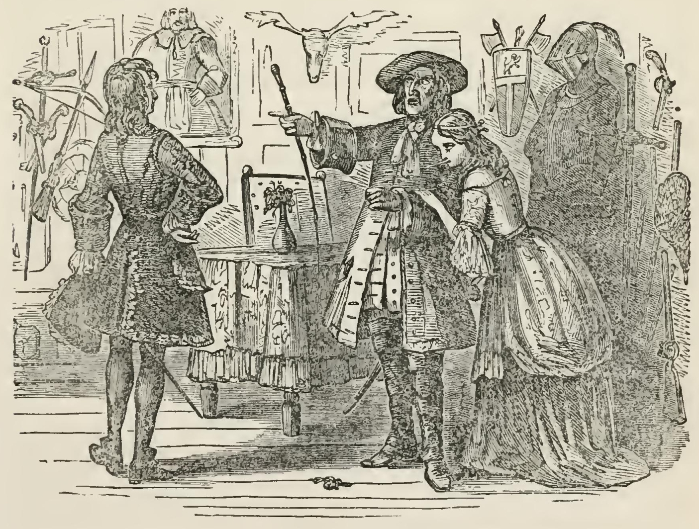 There was another guest, who sat, booted and spurred, at some distance from the fire also, and whose thoughts—to judge from his folded arms and knitted brows, and from the untasted liquor before him—were occupied with other matters than the topics under discussion or the persons who discussed them. This was a young man of about eight-and-twenty, rather above the middle height, and though of somewhat slight figure, gracefully and strongly made. He wore his own dark hair, and was accoutred in a riding dress, which together with his large boots (resembling in shape and fashion those worn by our Life Guardsmen at the present day), showed indisputable traces of the bad condition of the roads. But travel-stained though he was, he was well and even richly attired, and without being overdressed looked a gallant gentleman.
