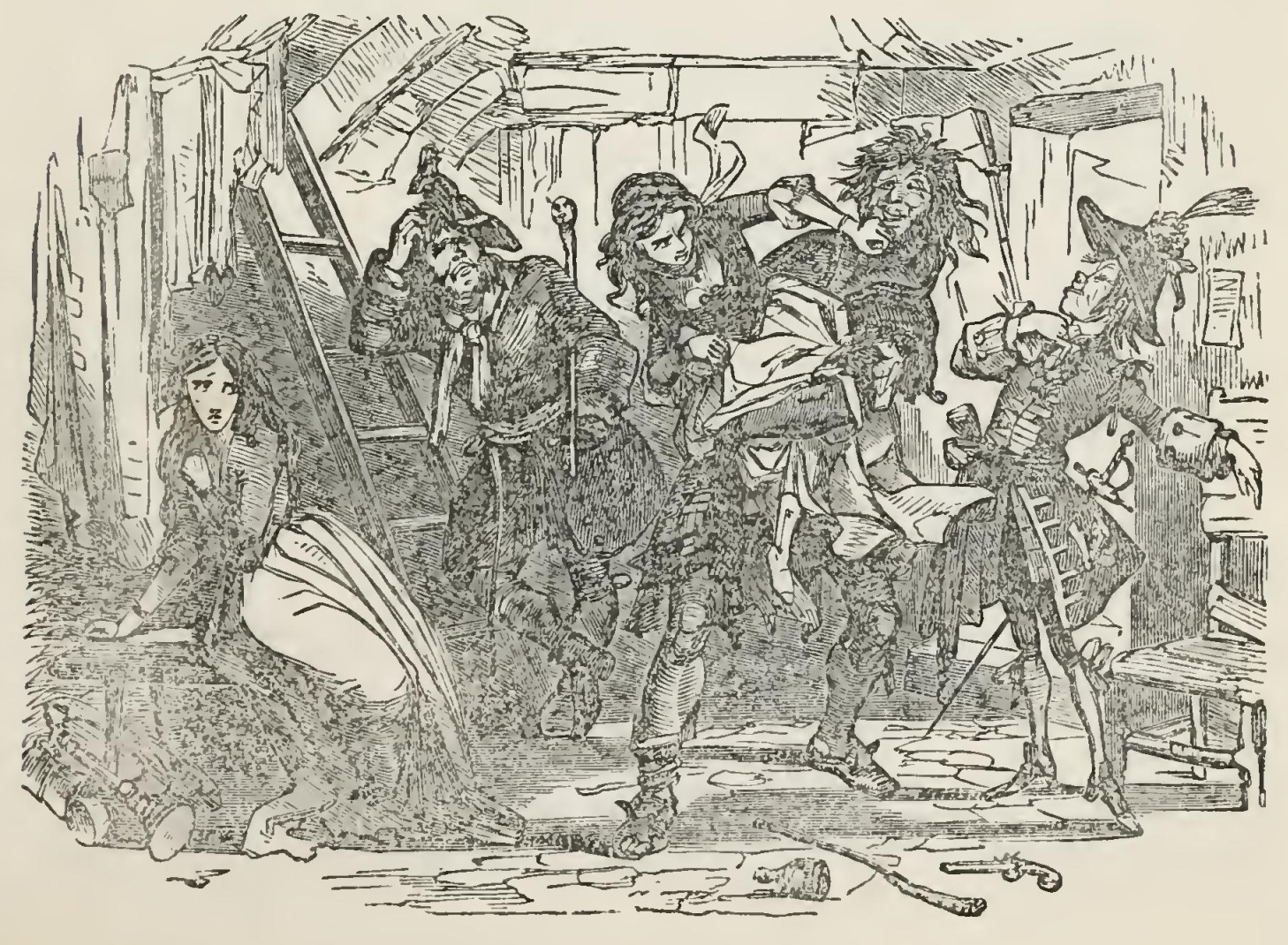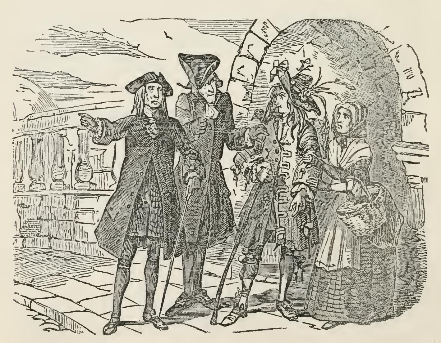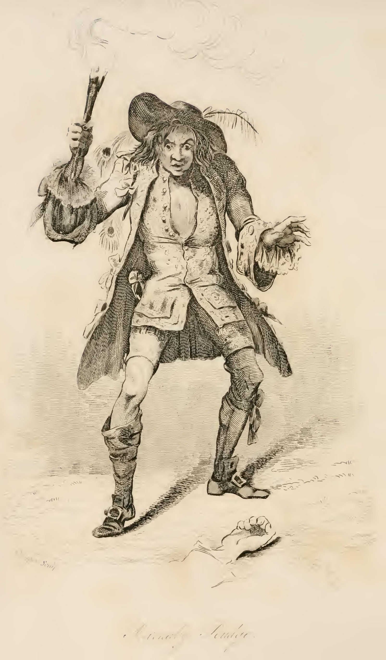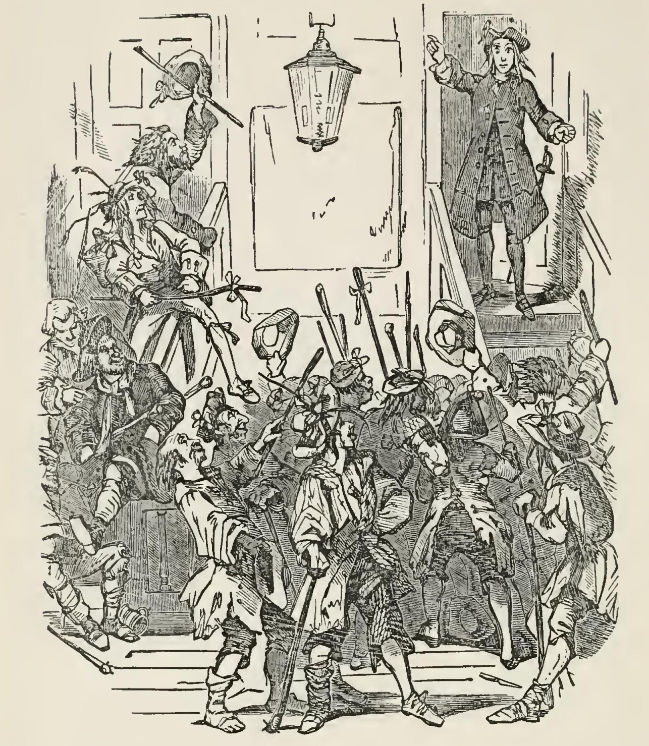 There was another guest, who sat, booted and spurred, at some distance from the fire also, and whose thoughts—to judge from his folded arms and knitted brows, and from the untasted liquor before him—were occupied with other matters than the topics under discussion or the persons who discussed them. This was a young man of about eight-and-twenty, rather above the middle height, and though of somewhat slight figure, gracefully and strongly made. He wore his own dark hair, and was accoutred in a riding dress, which together with his large boots (resembling in shape and fashion those worn by our Life Guardsmen at the present day), showed indisputable traces of the bad condition of the roads. But travel-stained though he was, he was well and even richly attired, and without being overdressed looked a gallant gentleman.