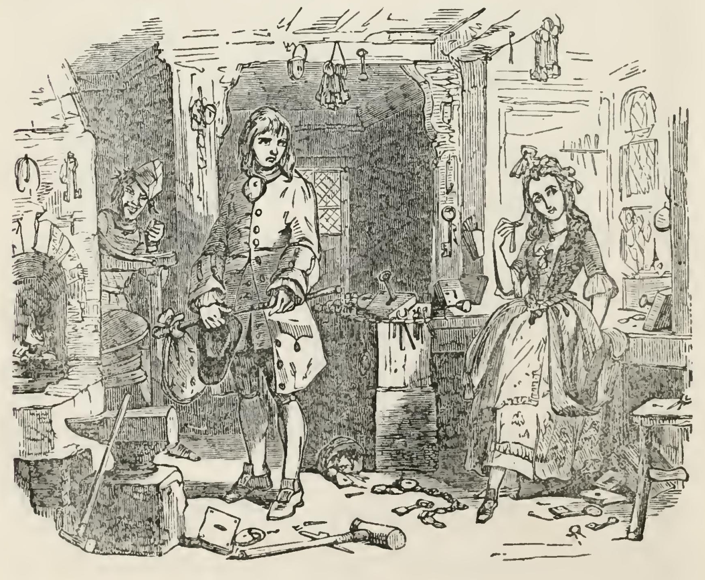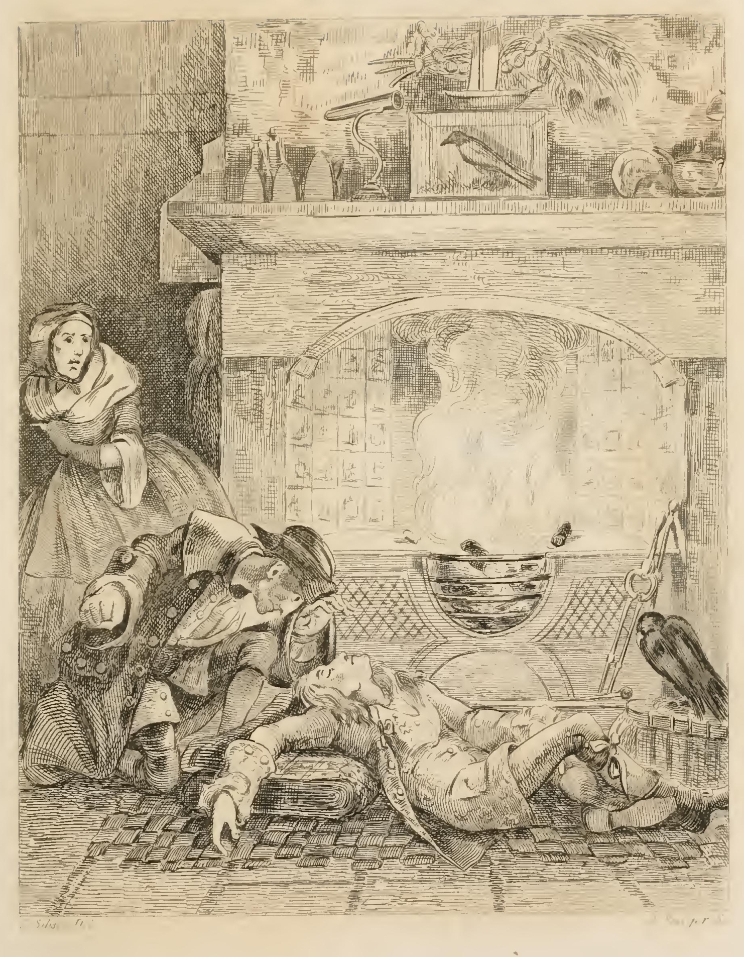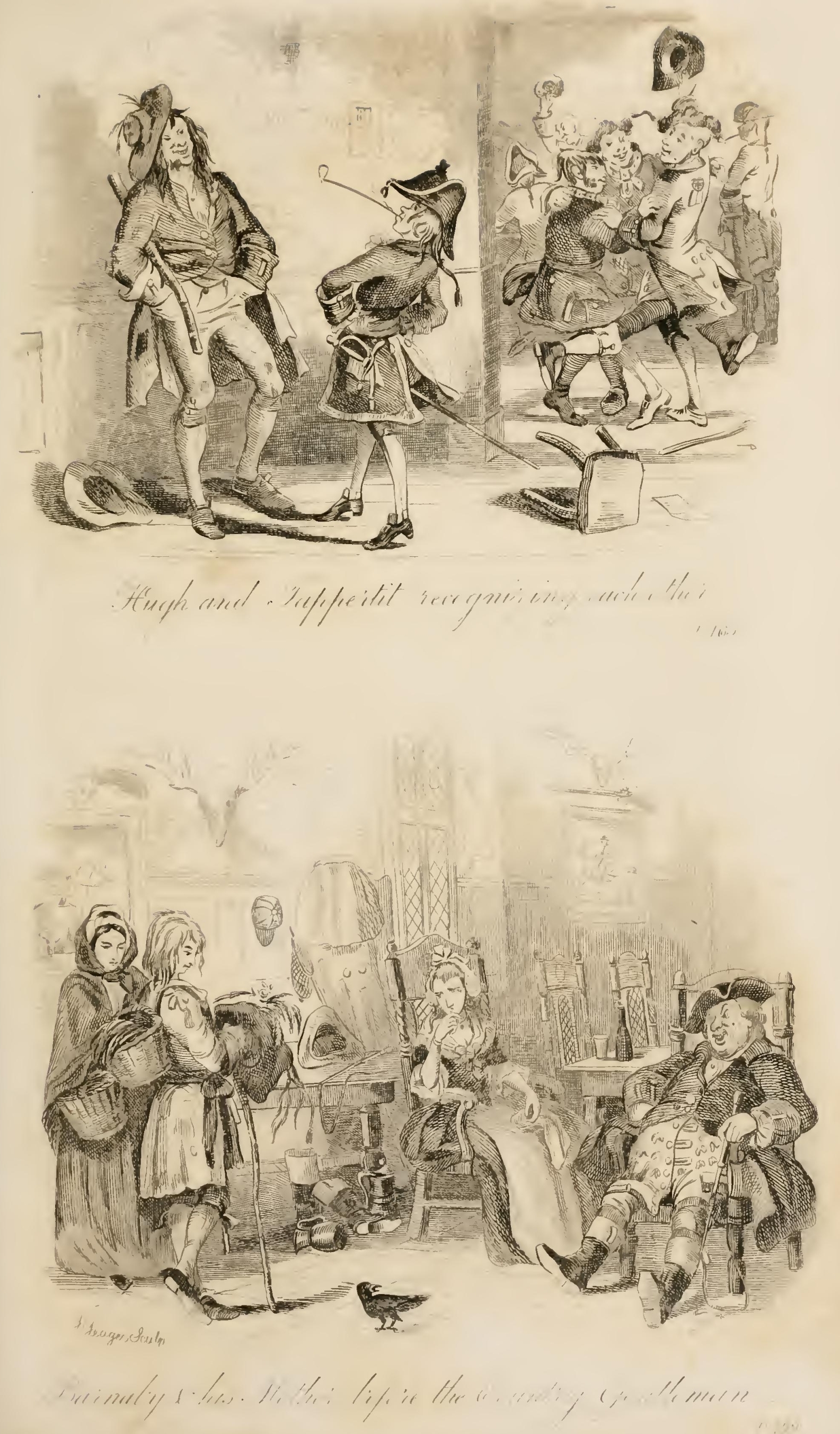 ‘Such a thing as love is!’ he said, drawing a chair near the fire, and looking round for sympathy. ‘He has set off to walk to London,—all the way to London. His nag gone lame in riding out here this blessed afternoon, and comfortably littered down in our stable at this minute; and he giving up a good hot supper and our best bed, because Miss Haredale has gone to a masquerade up in town, and he has set his heart upon seeing her! I don’t think I could persuade myself to do that, beautiful as she is,—but then I’m not in love (at least I don’t think I am) and that’s the whole difference.’