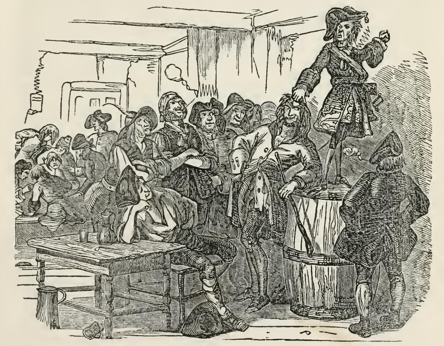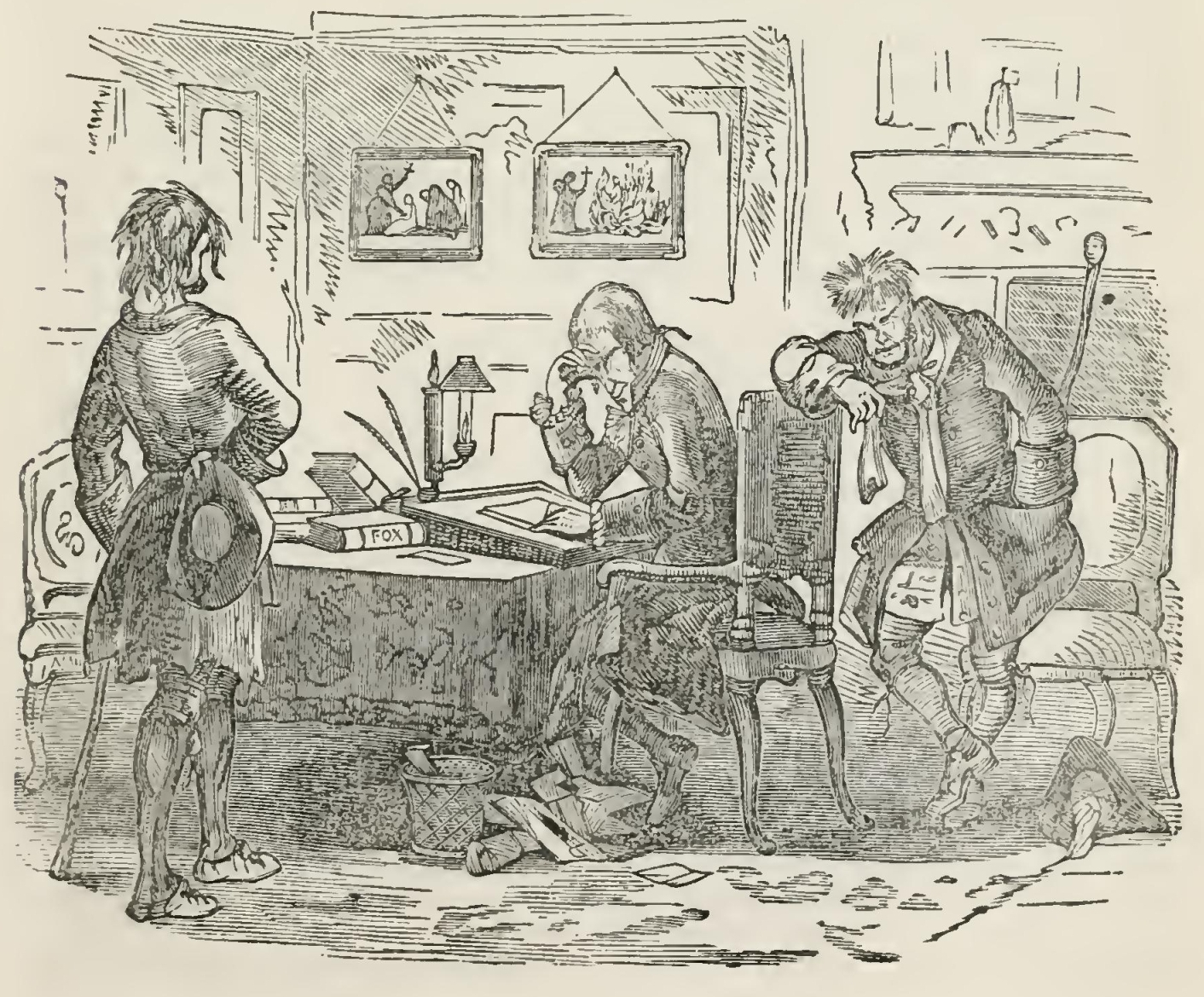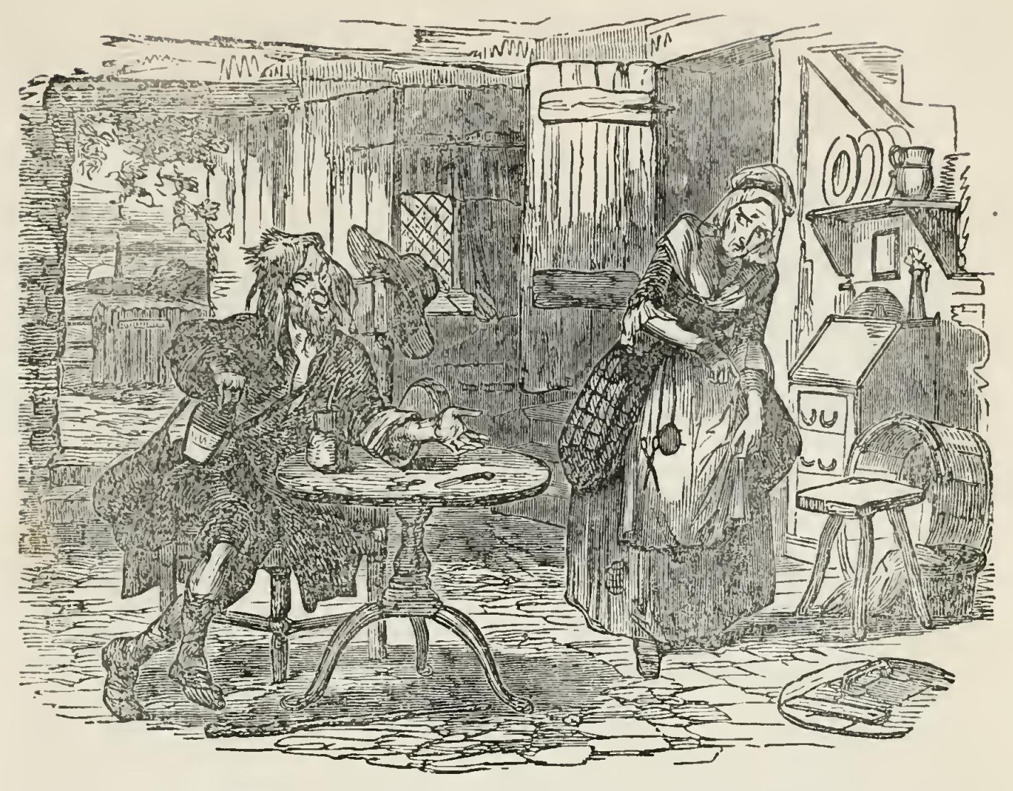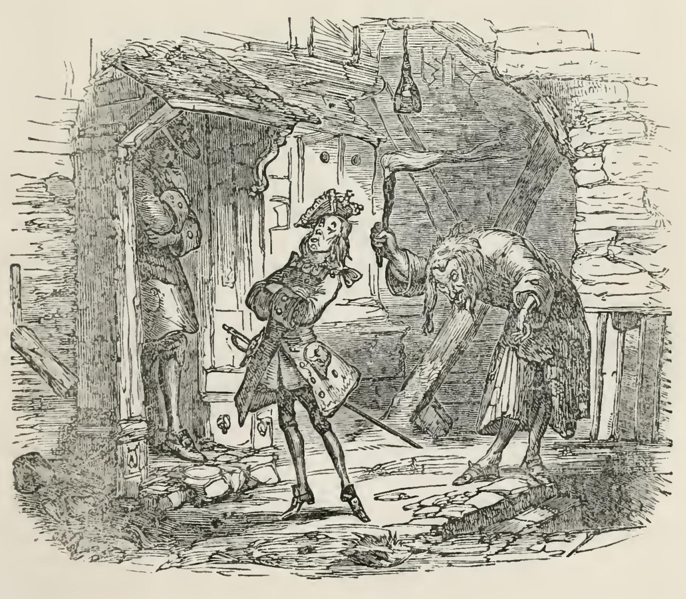 The stranger took off his hat, and disclosed the hard features of a man of sixty or thereabouts, much weatherbeaten and worn by time, and the naturally harsh expression of which was not improved by a dark handkerchief which was bound tightly round his head, and, while it served the purpose of a wig, shaded his forehead, and almost hid his eyebrows. If it were intended to conceal or divert attention from a deep gash, now healed into an ugly seam, which when it was first inflicted must have laid bare his cheekbone, the object was but indifferently attained, for it could scarcely fail to be noted at a glance. His complexion was of a cadaverous hue, and he had a grizzly jagged beard of some three weeks’ date. Such was the figure (very meanly and poorly clad) that now rose from the seat, and stalking across the room sat down in a corner of the chimney, which the politeness or fears of the little clerk very readily assigned to him.