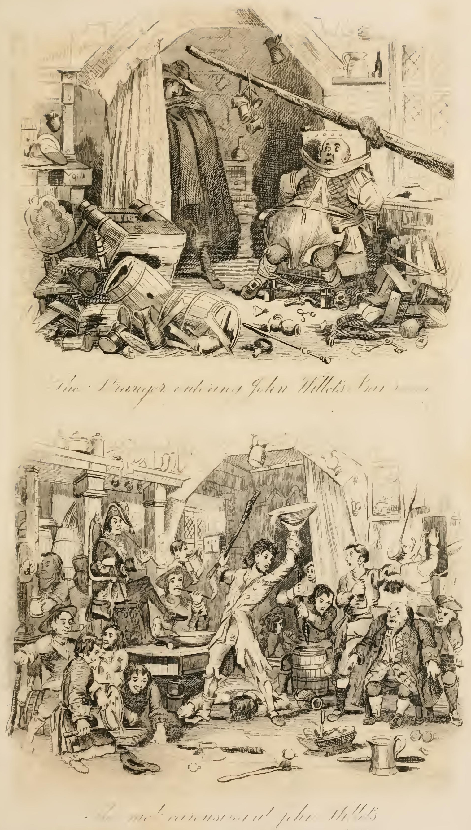 Again John waited leisurely until the observation had thoroughly penetrated to his brain, and then replying, ‘No offence as YET,’ applied a light to his pipe and smoked in placid silence; now and then casting a sidelong look at a man wrapped in a loose riding-coat with huge cuffs ornamented with tarnished silver lace and large metal buttons, who sat apart from the regular frequenters of the house, and wearing a hat flapped over his face, which was still further shaded by the hand on which his forehead rested, looked unsociable enough.