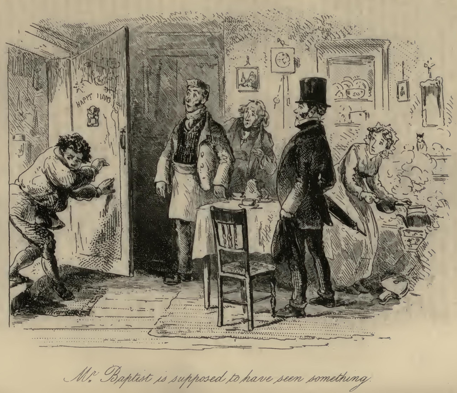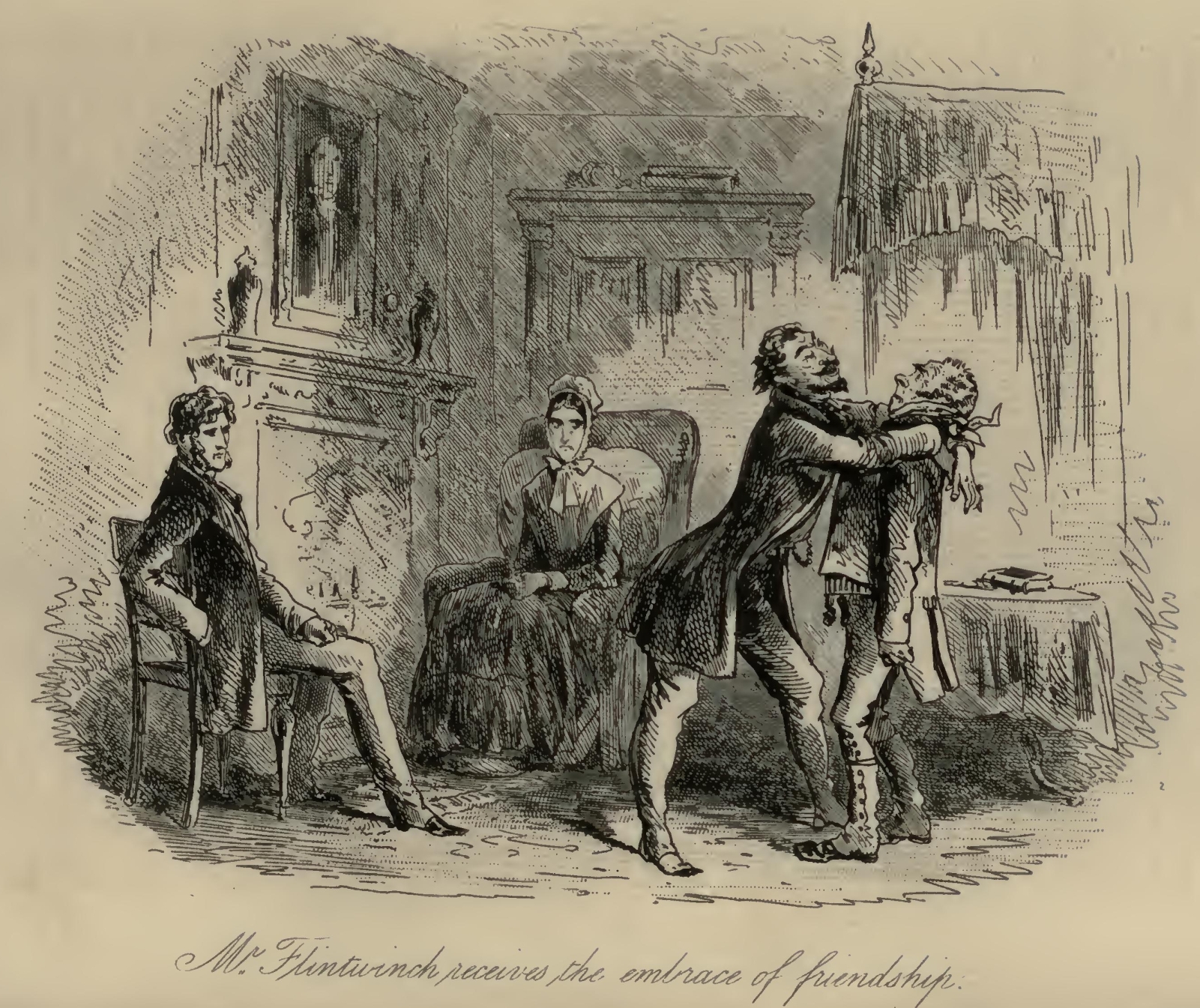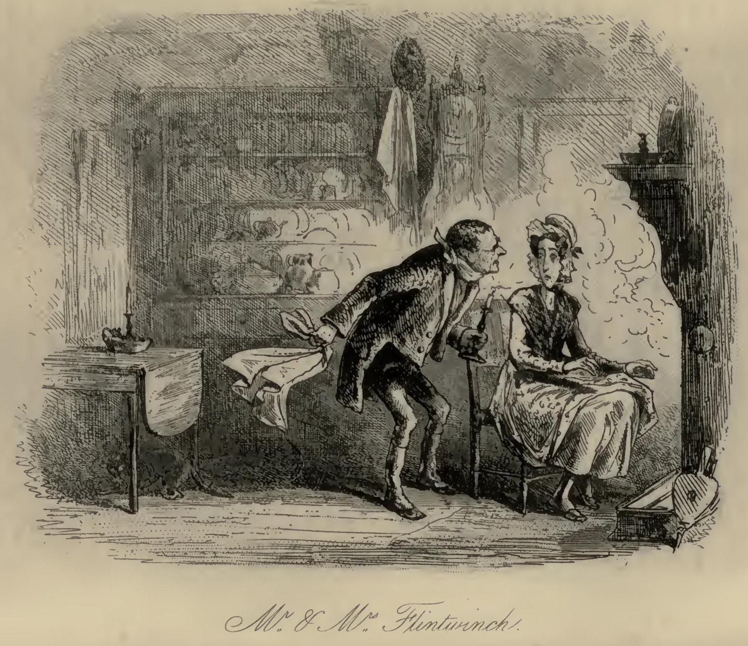 Flora tried in vain to soothe the excellent woman by explaining that they were going home to dinner. Mr F.‘s Aunt persisted in replying, ‘Bring him for’ard and I’ll chuck him out o’ winder!’ Having reiterated this demand an immense number of times, with a sustained glare of defiance at Little Dorrit, Mr F.‘s Aunt folded her arms, and sat down in the corner of the pie-shop parlour; steadfastly refusing to budge until such time as ‘he’ should have been ‘brought for’ard,’ and the chucking portion of his destiny accomplished.
