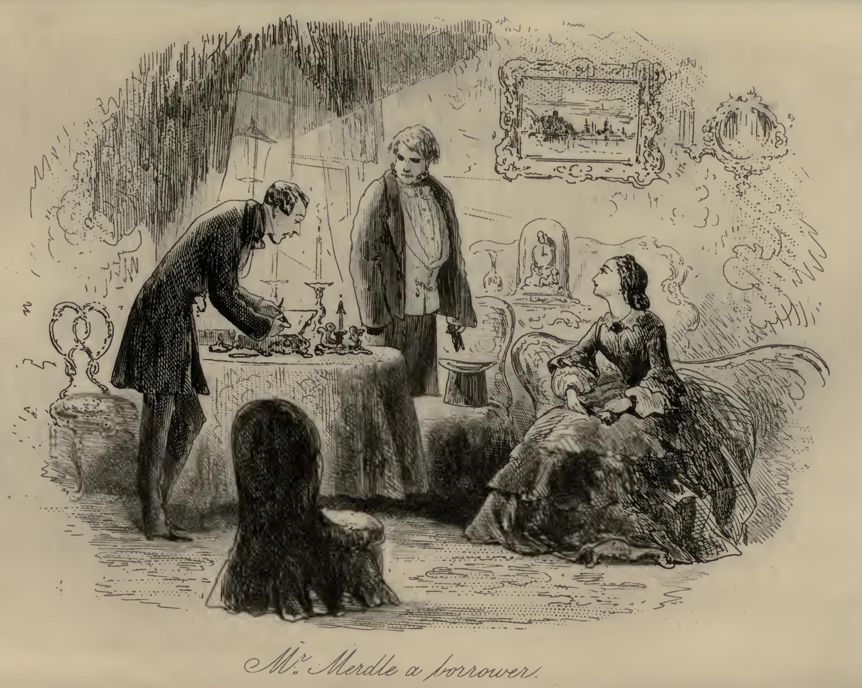 ‘Oh, egad!’ said Mr Meagles, shaking his head very seriously, ‘he must hide all those things under lock and key when he comes over here. They won’t do over here. In that particular, Britannia is a Britannia in the Manger—won’t give her children such distinctions herself, and won’t allow them to be seen when they are given by other countries. No, no, Dan!’ said Mr Meagles, shaking his head again. ‘That won’t do here!’